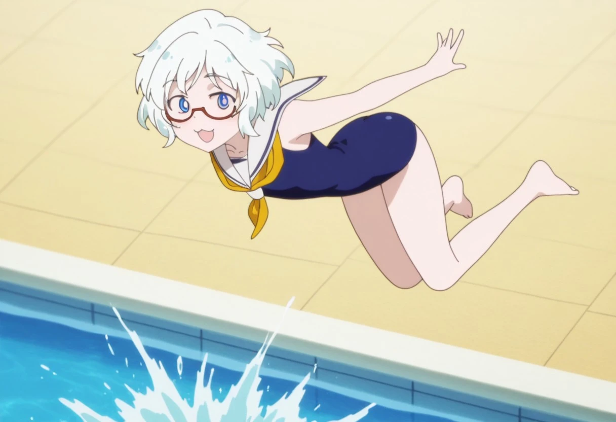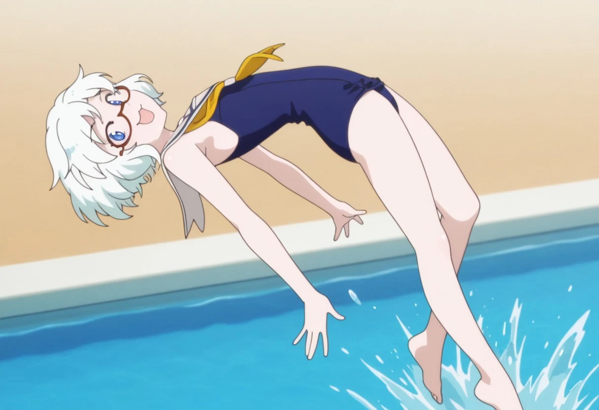 white hair , :3 , red-framed eyewear , fins , small breasts