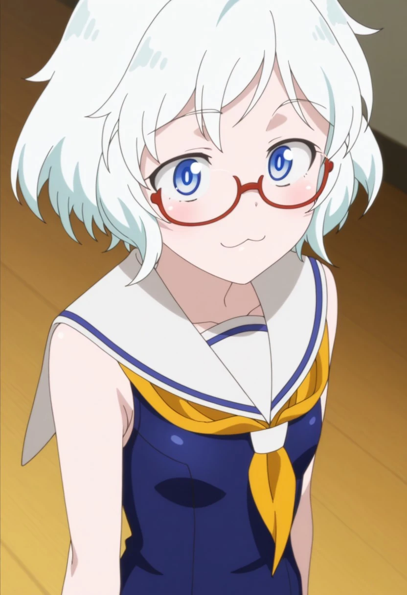 Appearance : white hair , :3 , red-framed eyewear , fins , small breasts