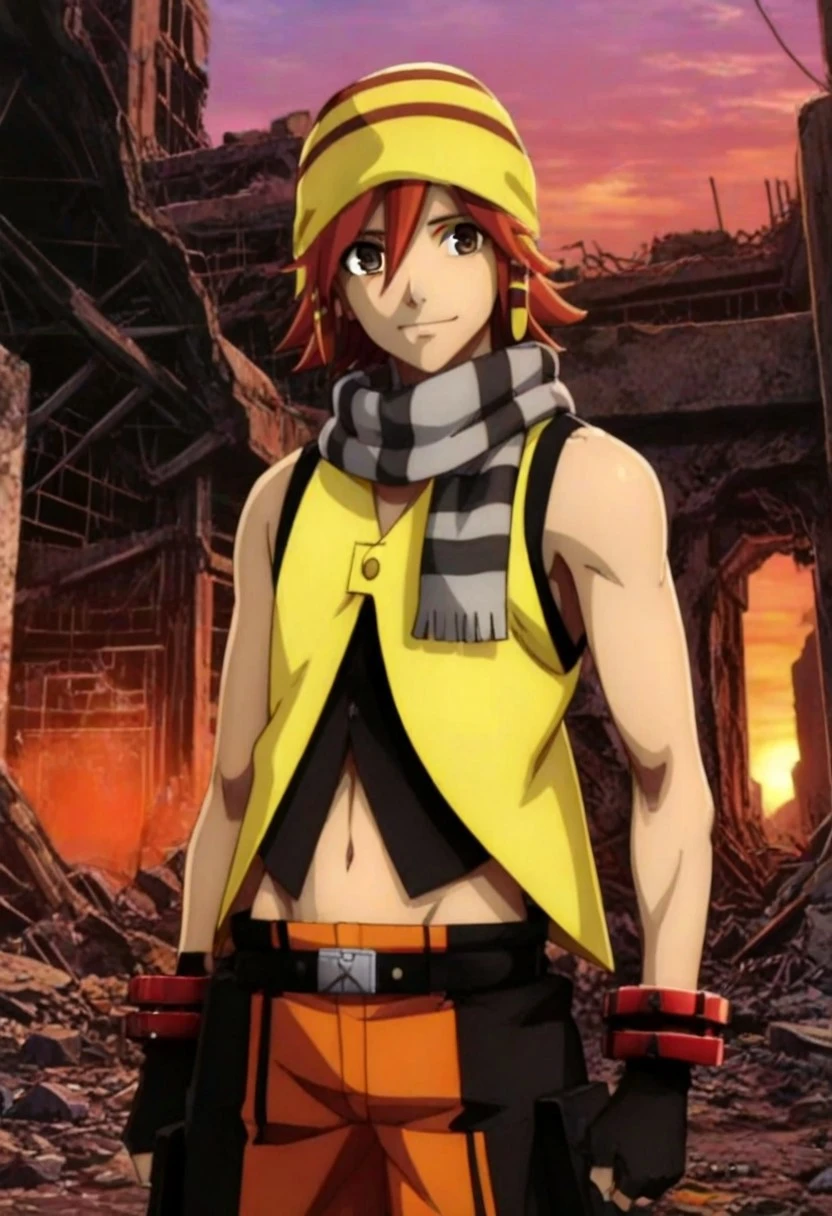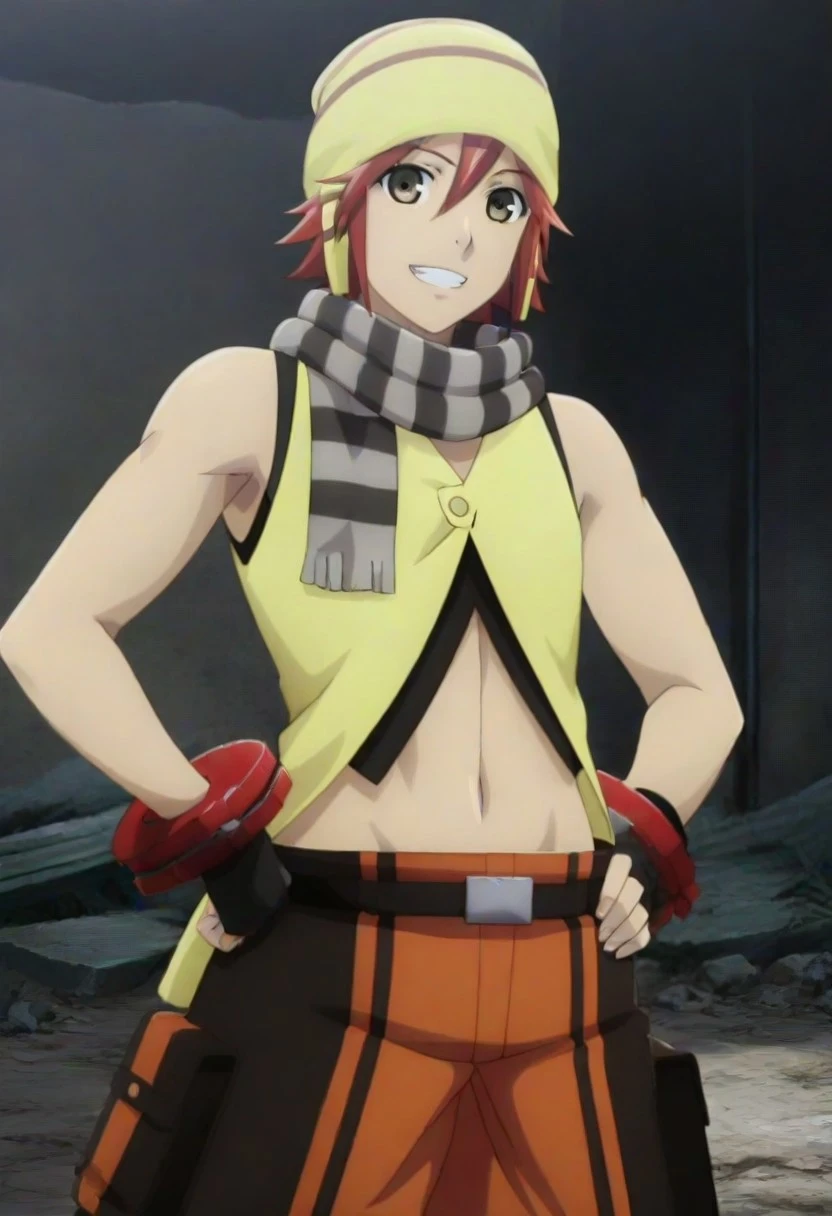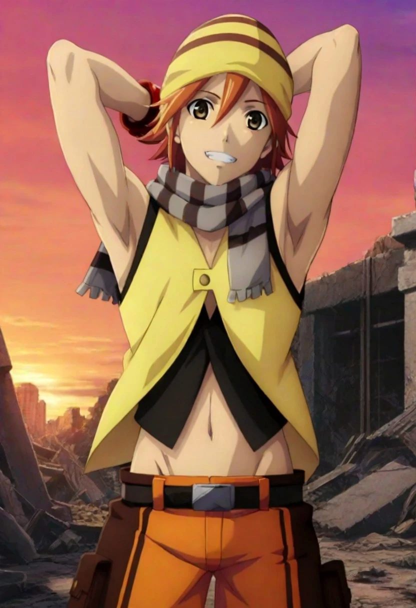 Kouta Fujiki, red-orange hair, brown eyes, yellow beanie with orange stripes, gray striped scarf, yellow open vest, single button, black undershirt, sleeveless, midriff, black fingerless gloves, red wrist brace, belt, black and orange shorts, black and orange shoes