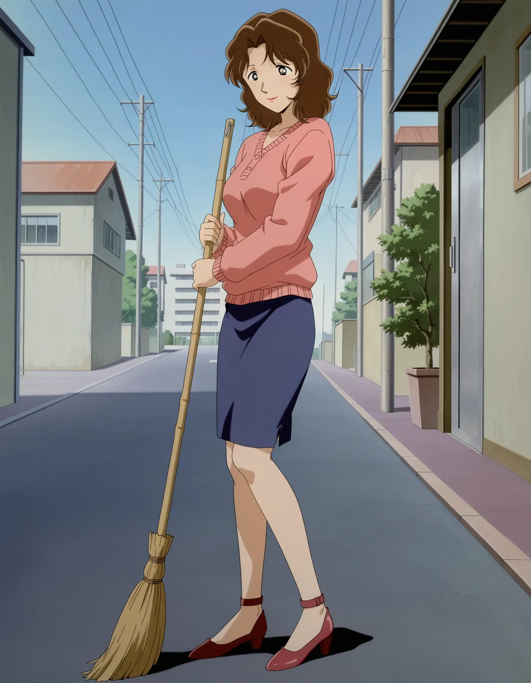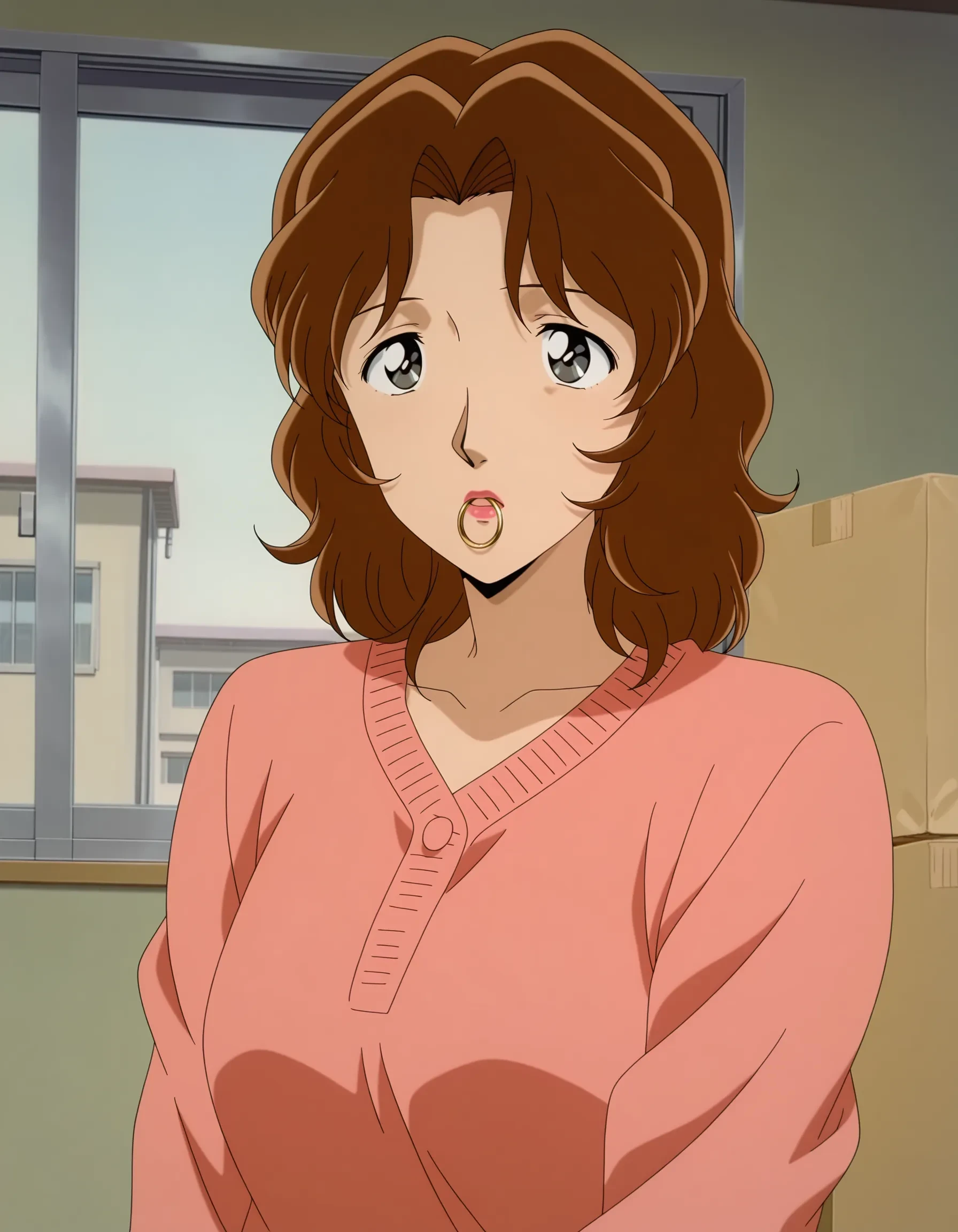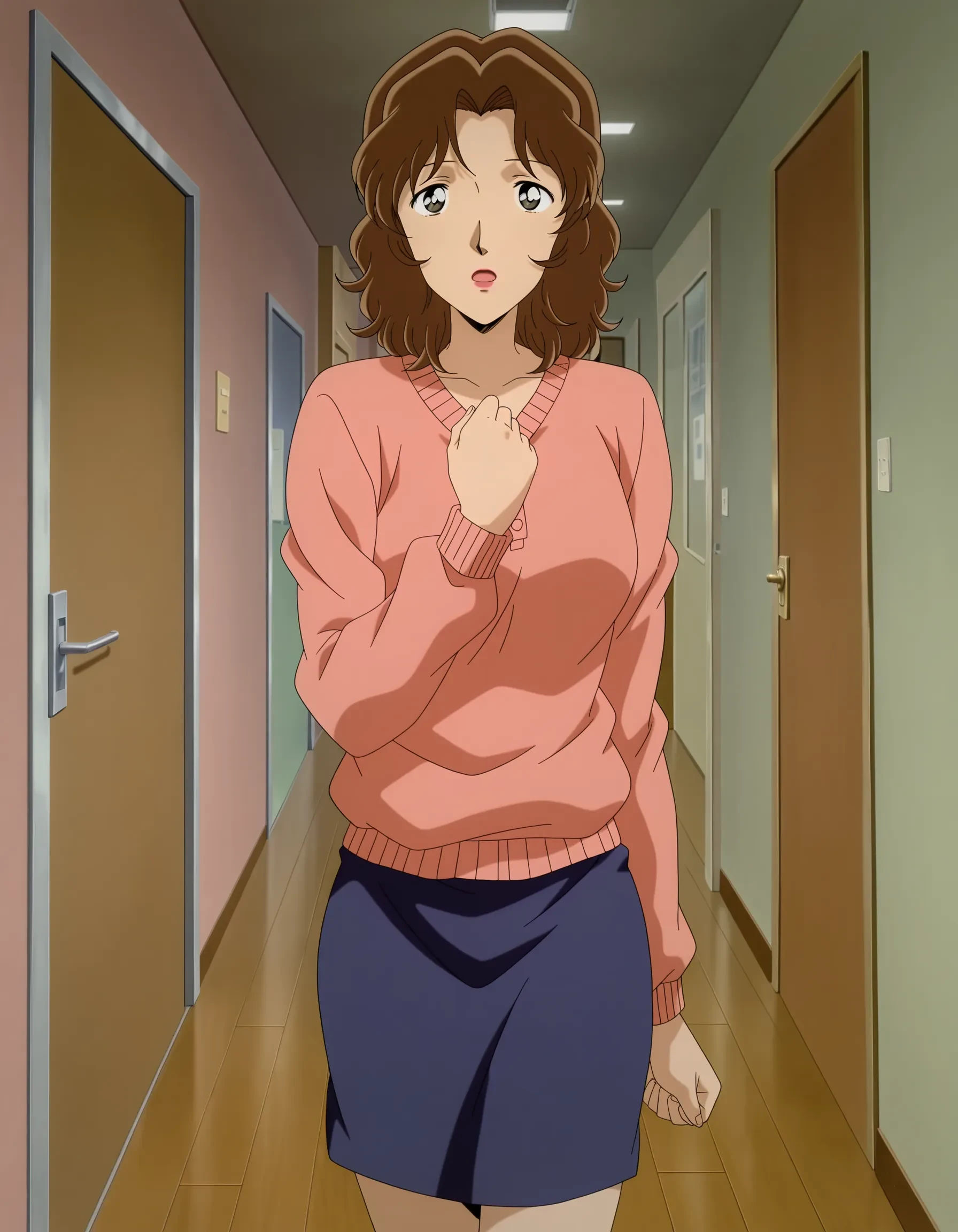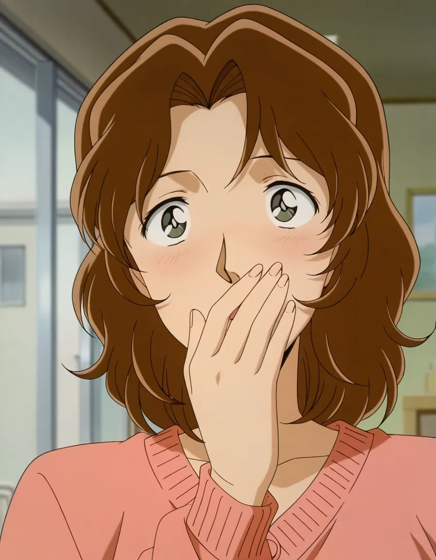 uehara misato,brown hair,medium hair,wavy hair,parted bangs,black eyes,lipstick,mature female,