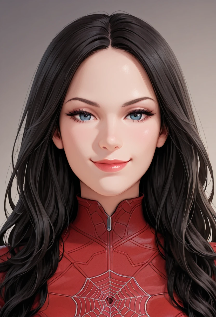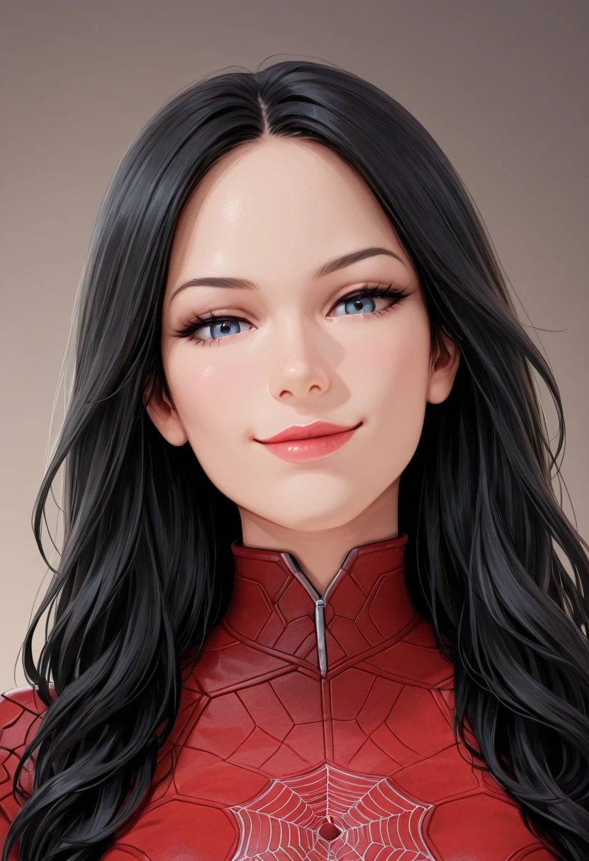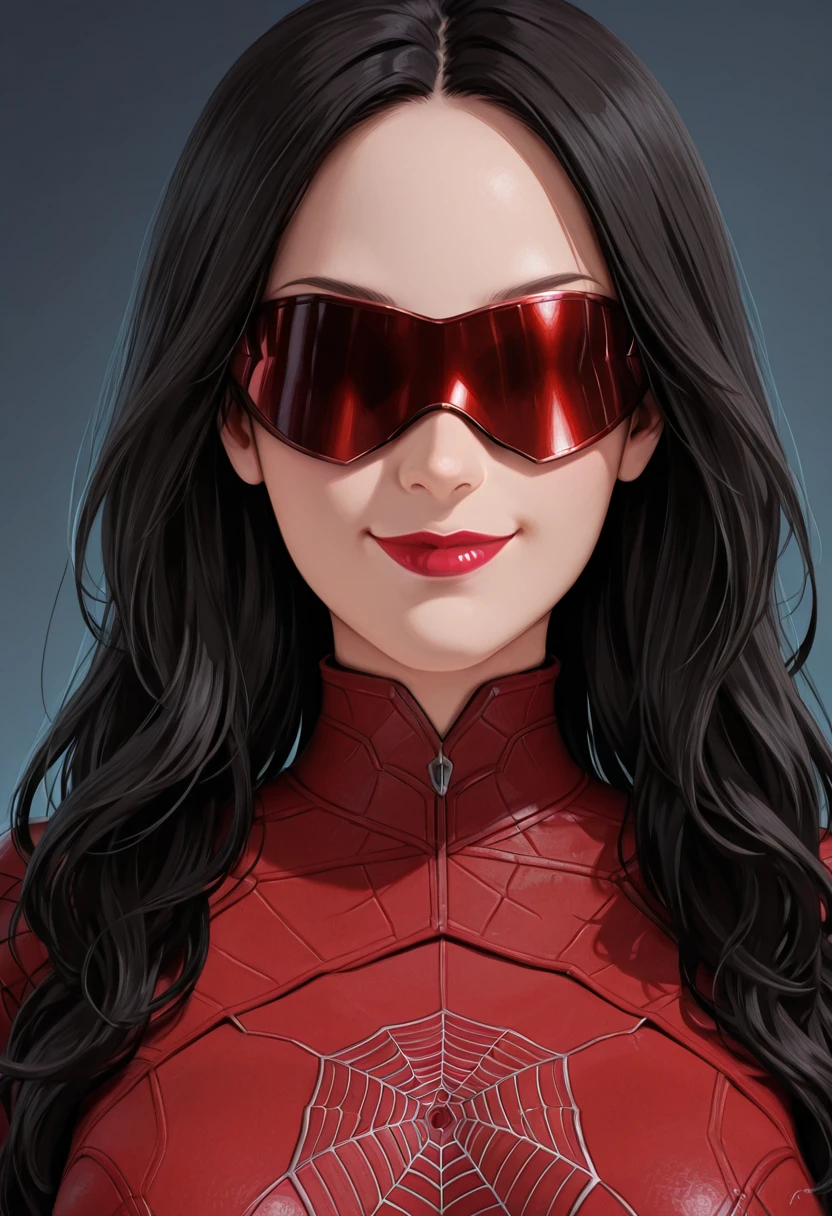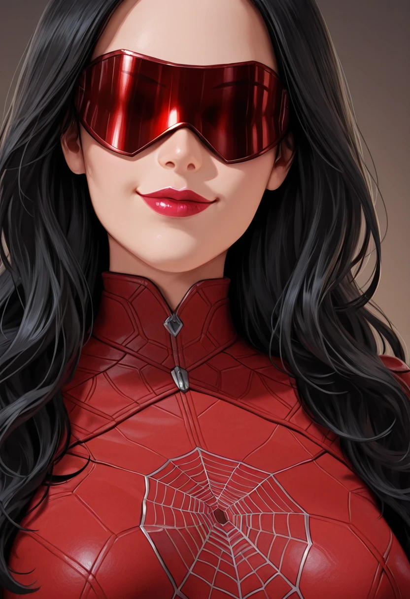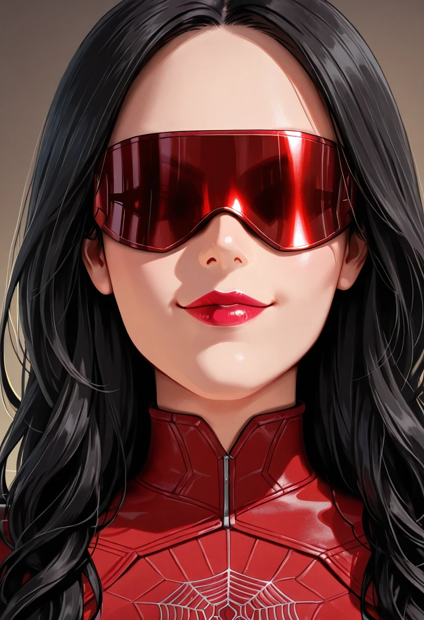 Prompt: 1girl, solo, MadameW3b, female focus, red bodysuit, red boots, long hair, black hair, high collar, lipstick, red boots