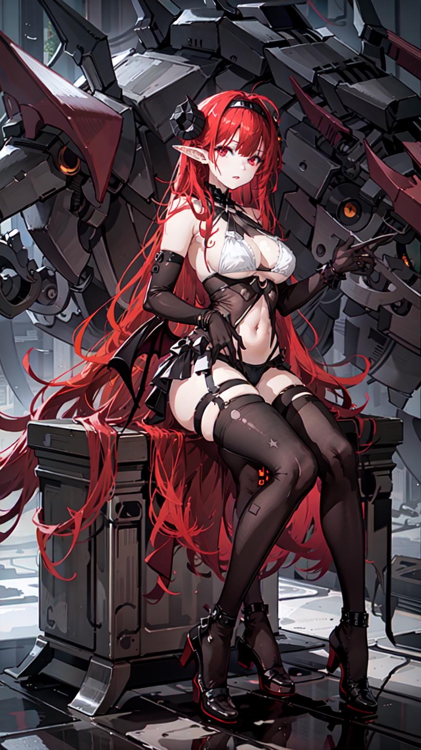 1girl, long hair, full body, horns, red hair, breasts, pointy ears, (white bikini:1.2), large breasts, solo, bangs, red eyes, demon horns, parted lips, ahoge, leotard, demon girl, hairband, covered navel, demon wings, frills, hair intakes, <lora:SMSHindenburgV2-000008:0.7>, ironhindenburg, blue sky,