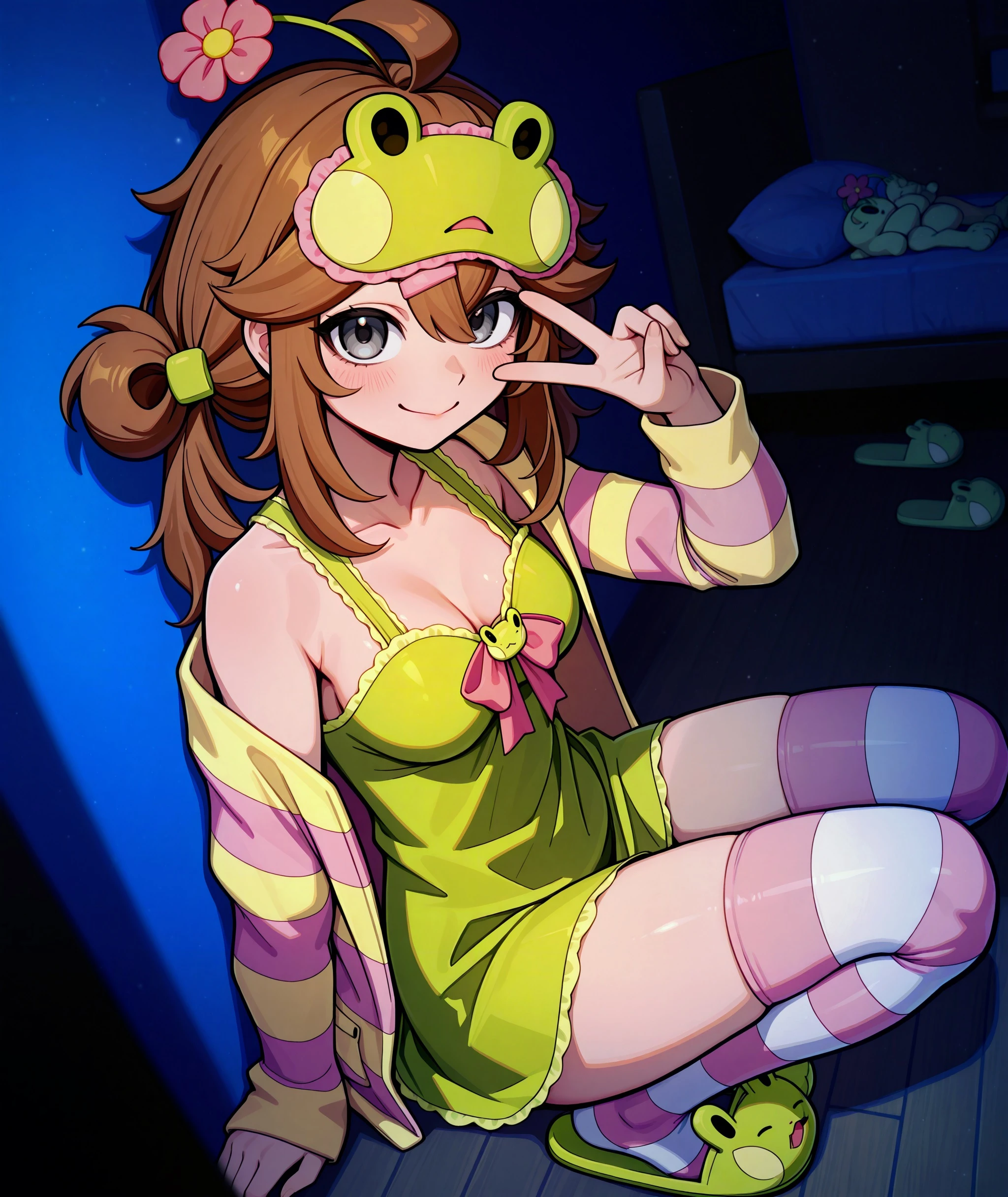 grey eyes, brown hair, low twintails, folded twintails, ahoge, sleep mask, hair ornament, flower on head,