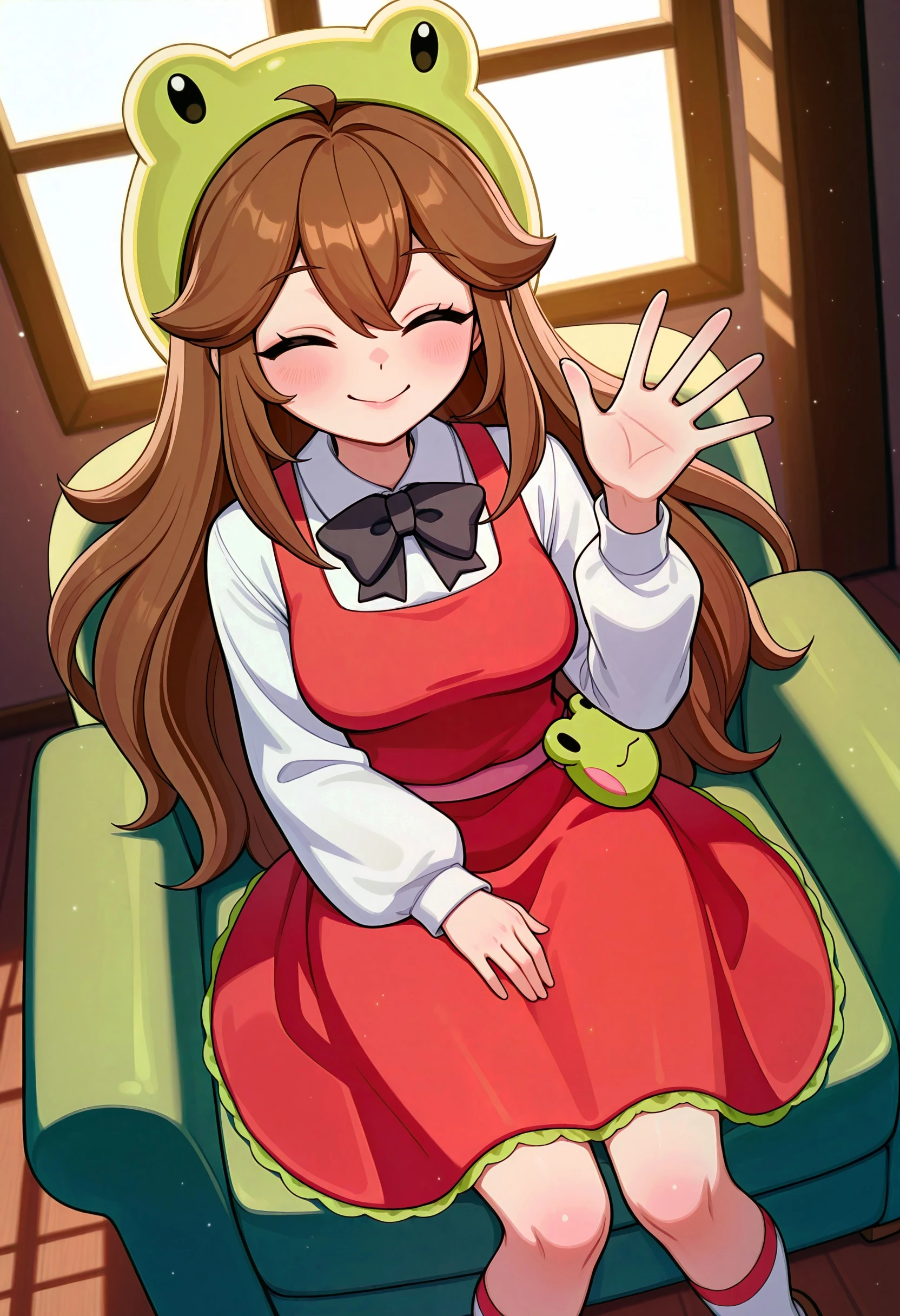 grey eyes, brown hair, long hair, hair down, frog hat, frog hair ornament,