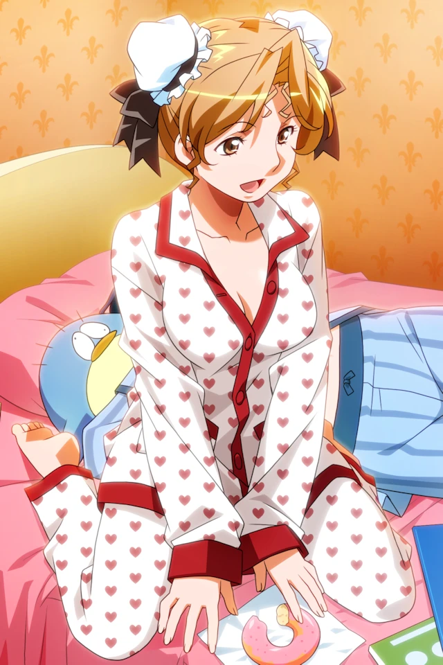 hayasaka akira, tanaka ryou, light brown hair, double bun, bun cover, brown eyes, large breasts