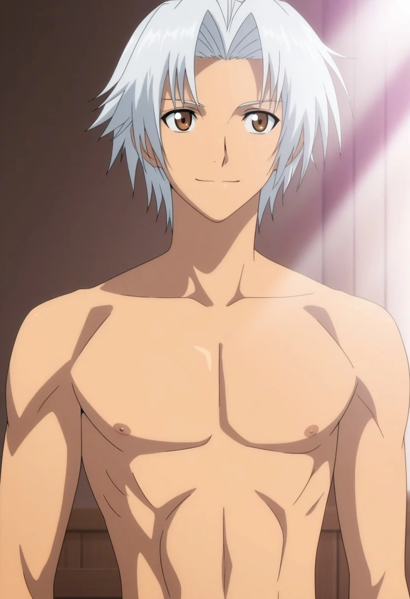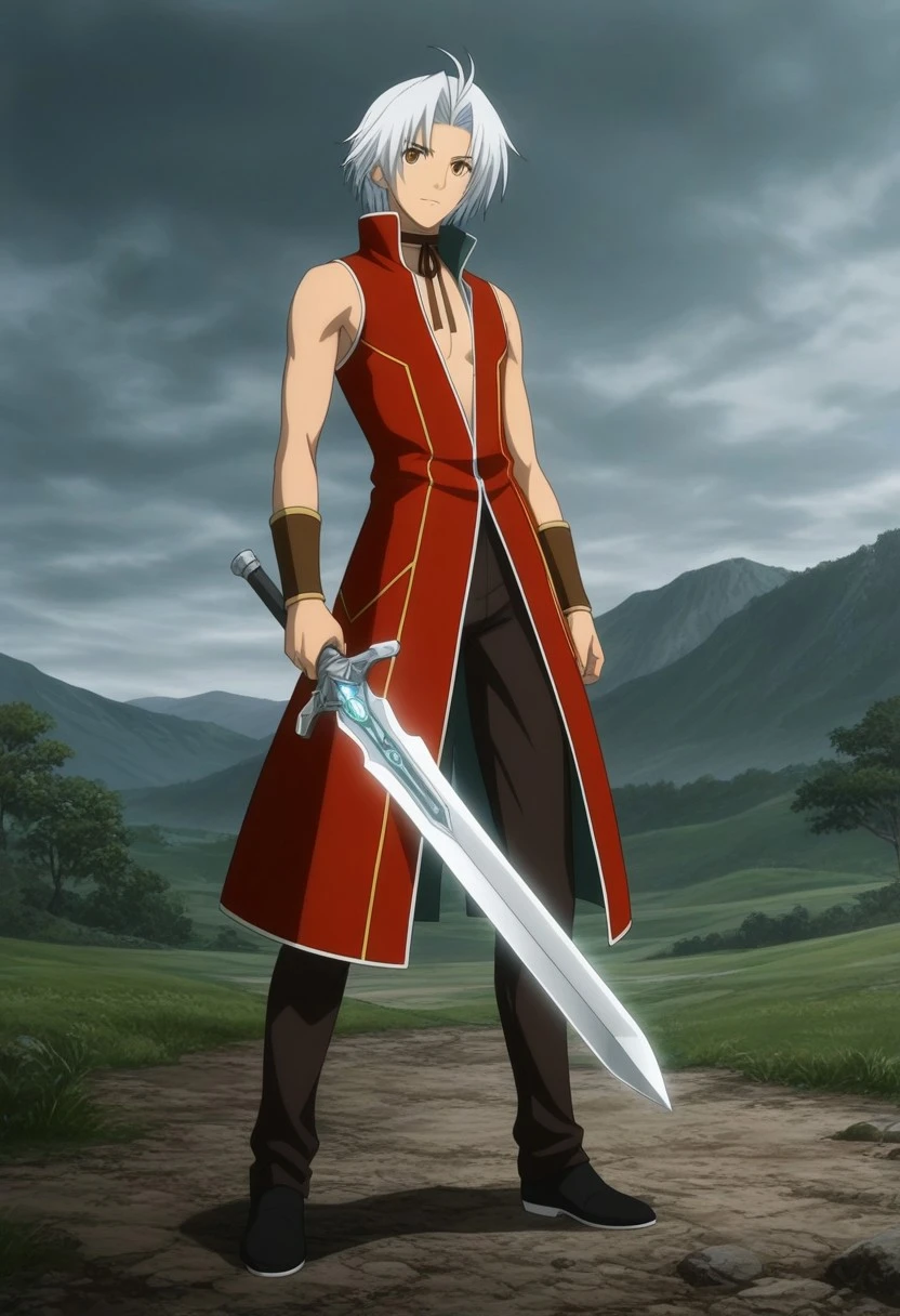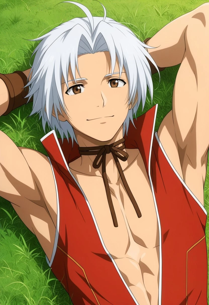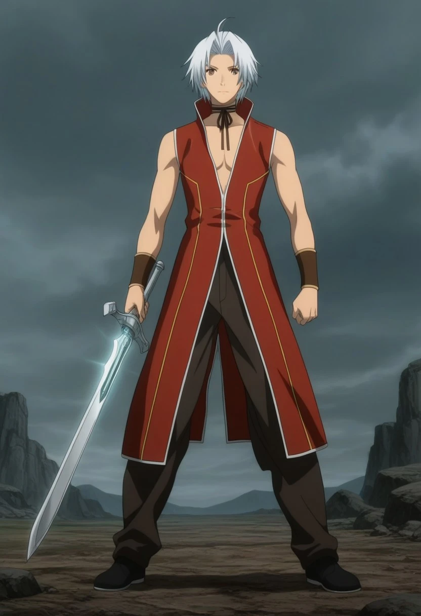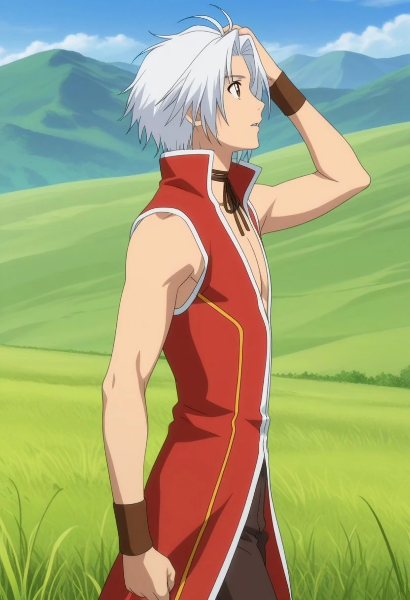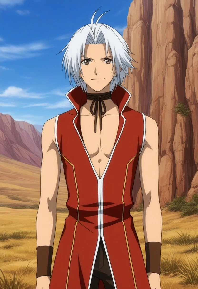Souma Akizuki, white hair, split bangs, brown eyes, brown rope bow choker, long sleeveless red coat, popped collar, low neckline, white and gold accents, brown wristbands, black-brown pants