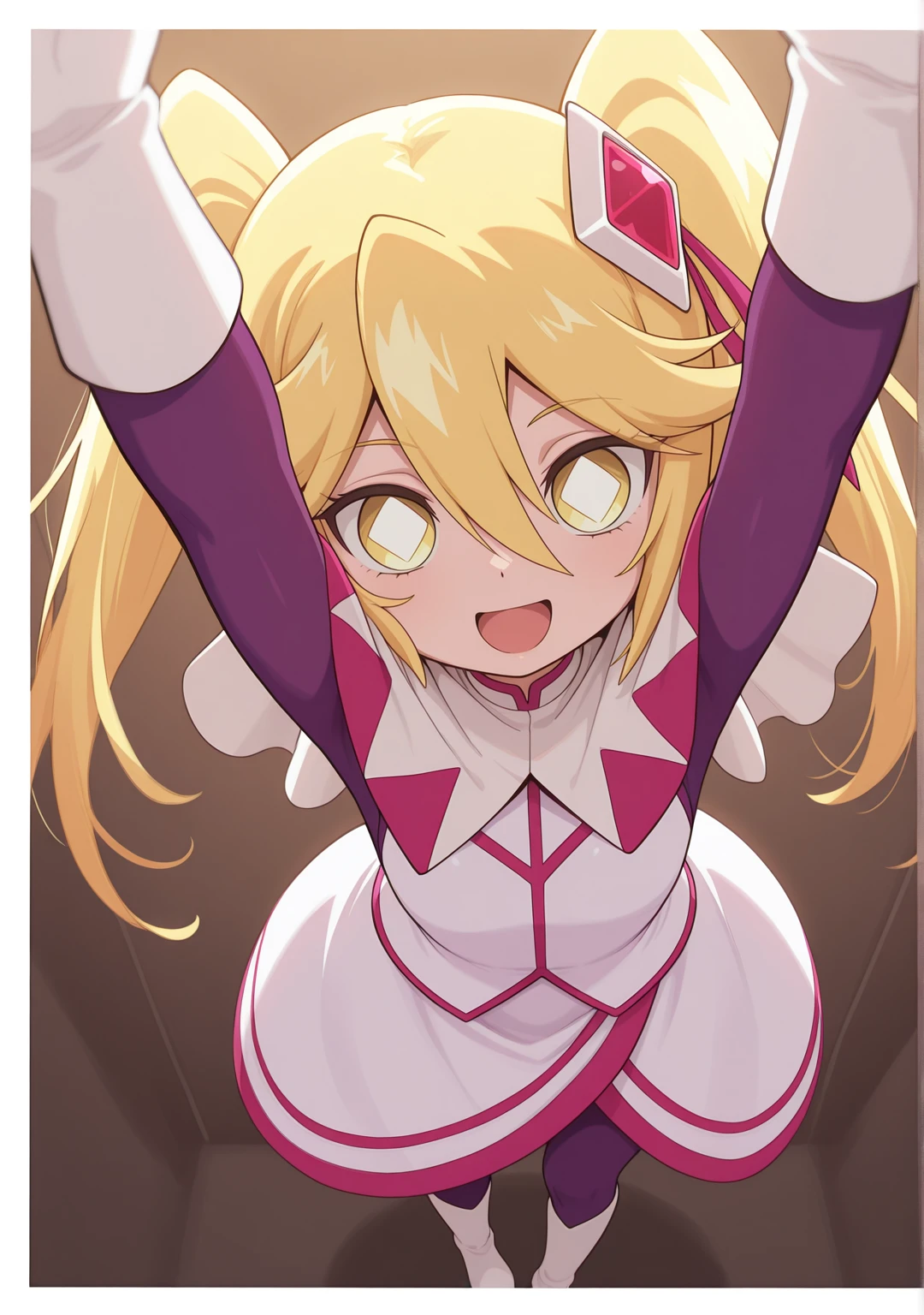 dia-queen-kj,blonde hair,yellow eyes,white boots,dress,hair between eyes,hair ornament,hair ribbon,long hair,purple ,ribbon,white pupils,symbol-shaped pupils,twintails,white capelet,white footwear,white gloves,white skirt