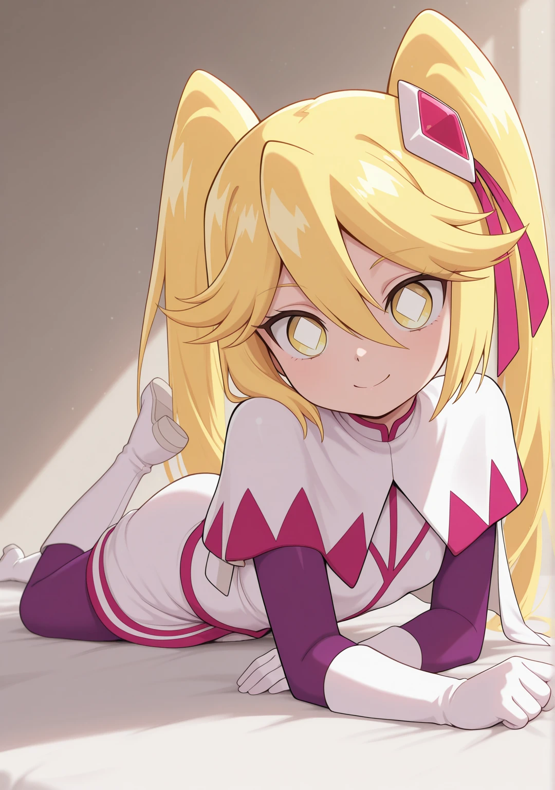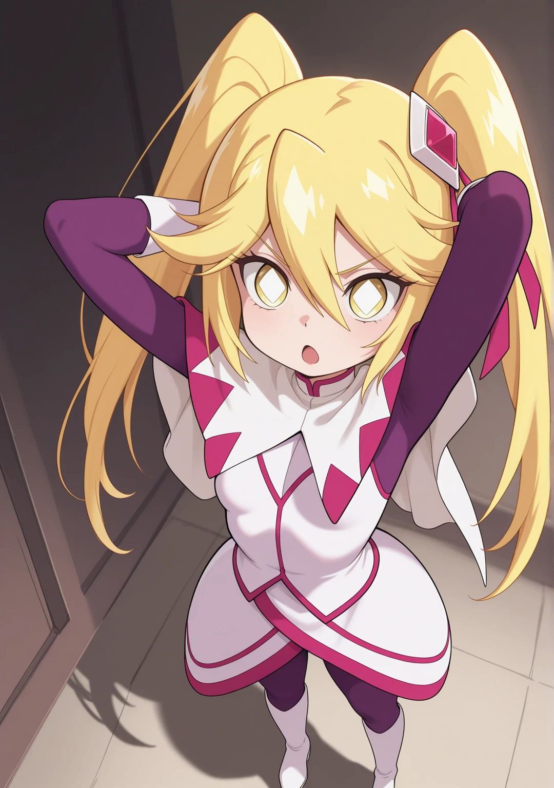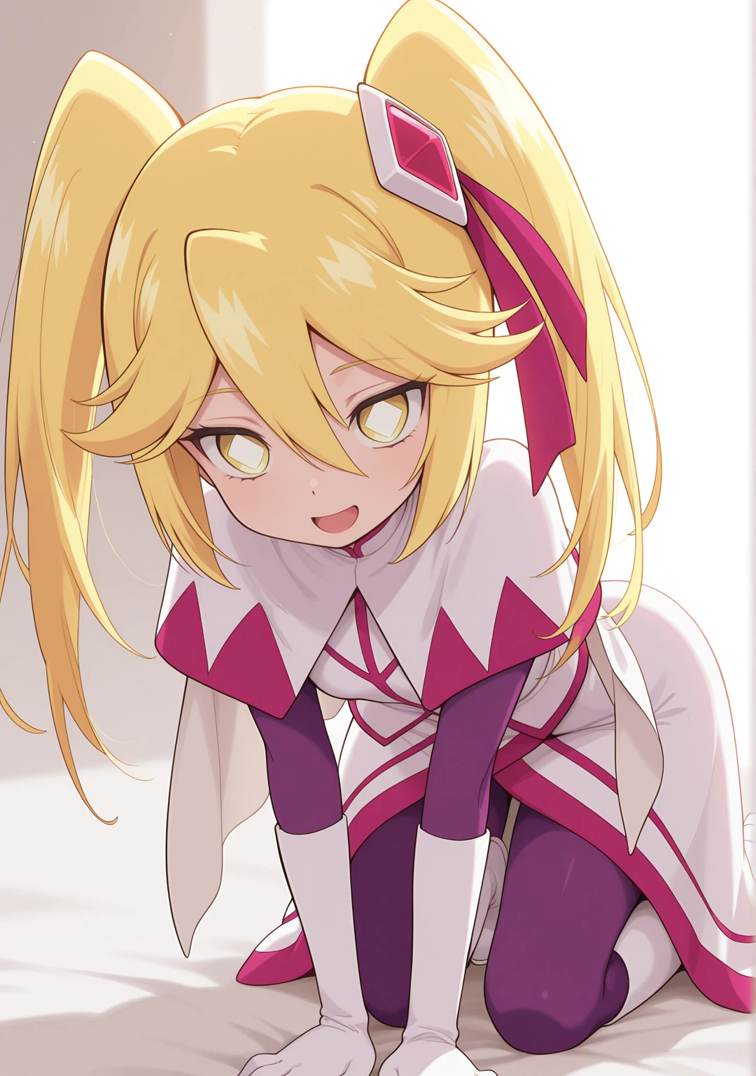 recommend:blonde hair,yellow eyes,white boots,dress,hair between eyes,hair ornament,hair ribbon,long hair,purple bodysuit,ribbon,white pupils,symbol-shaped pupils,twintails,white capelet,white footwear,white gloves,white skirt,
