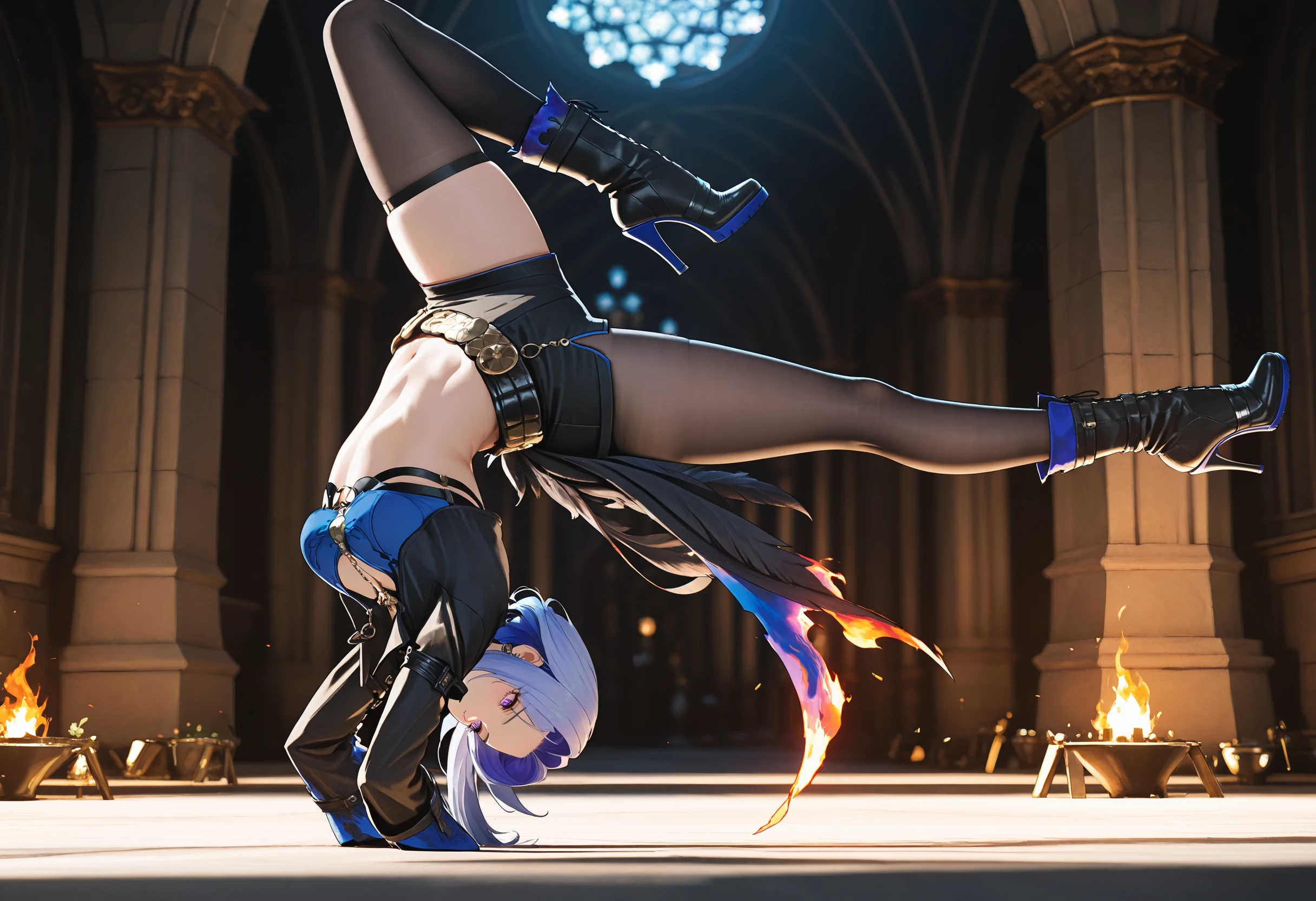 Default outfit: snake earring, gold jewelry, gold choker, cropped jacket, long sleeves, black gloves, claw ring, feather trim, feather tail (right shoulder), shoulder accessory, right shoulder visible, criss-cross halter, blue crop top, snake buckle belt, black skirt, flame hem, black shorts, thigh strap, ring straps, ammo thigh belt (right), asymmetrical legwear, single-leg pantyhose (right), single thighhigh (left), black stiletto boots, blue boots soles