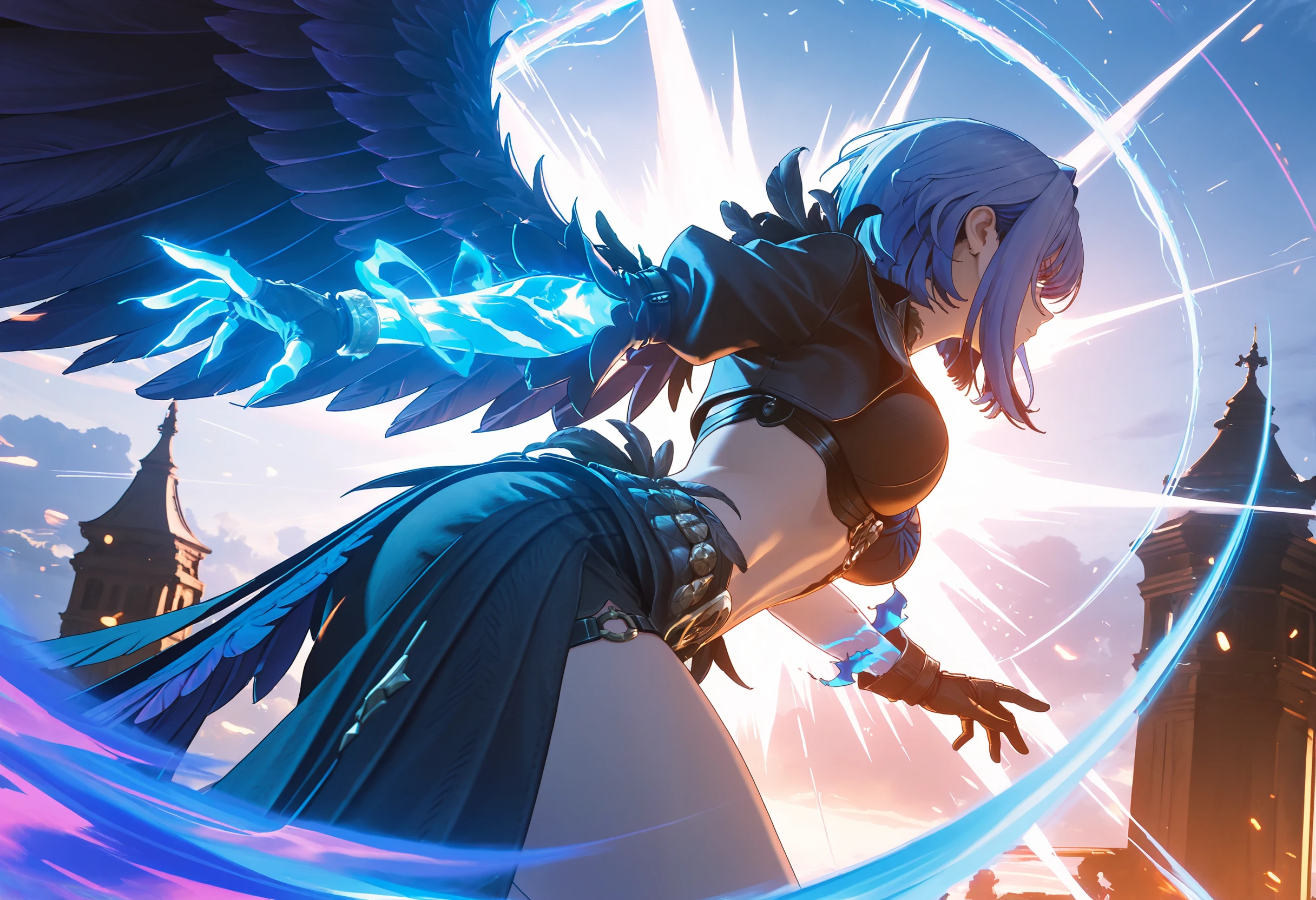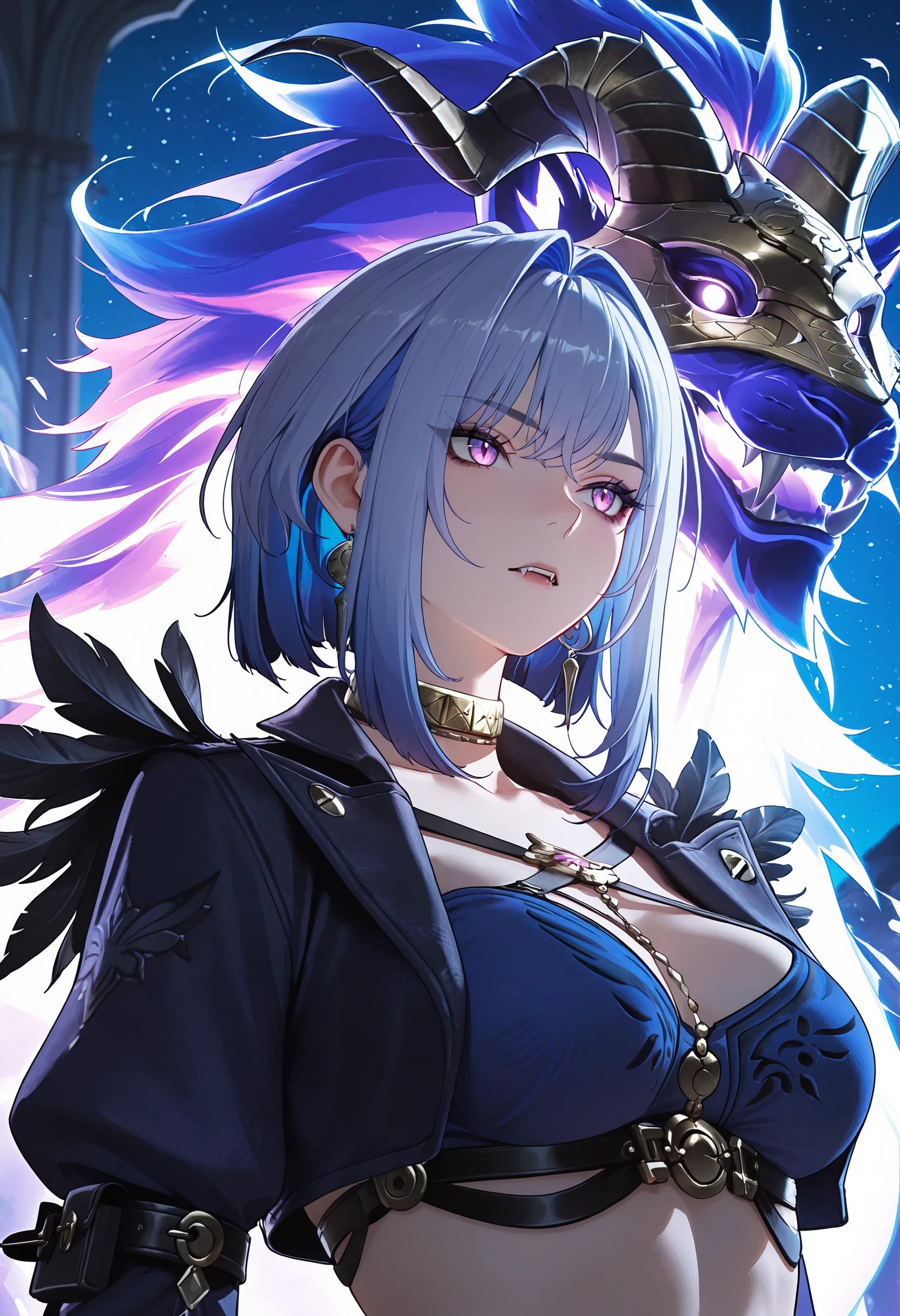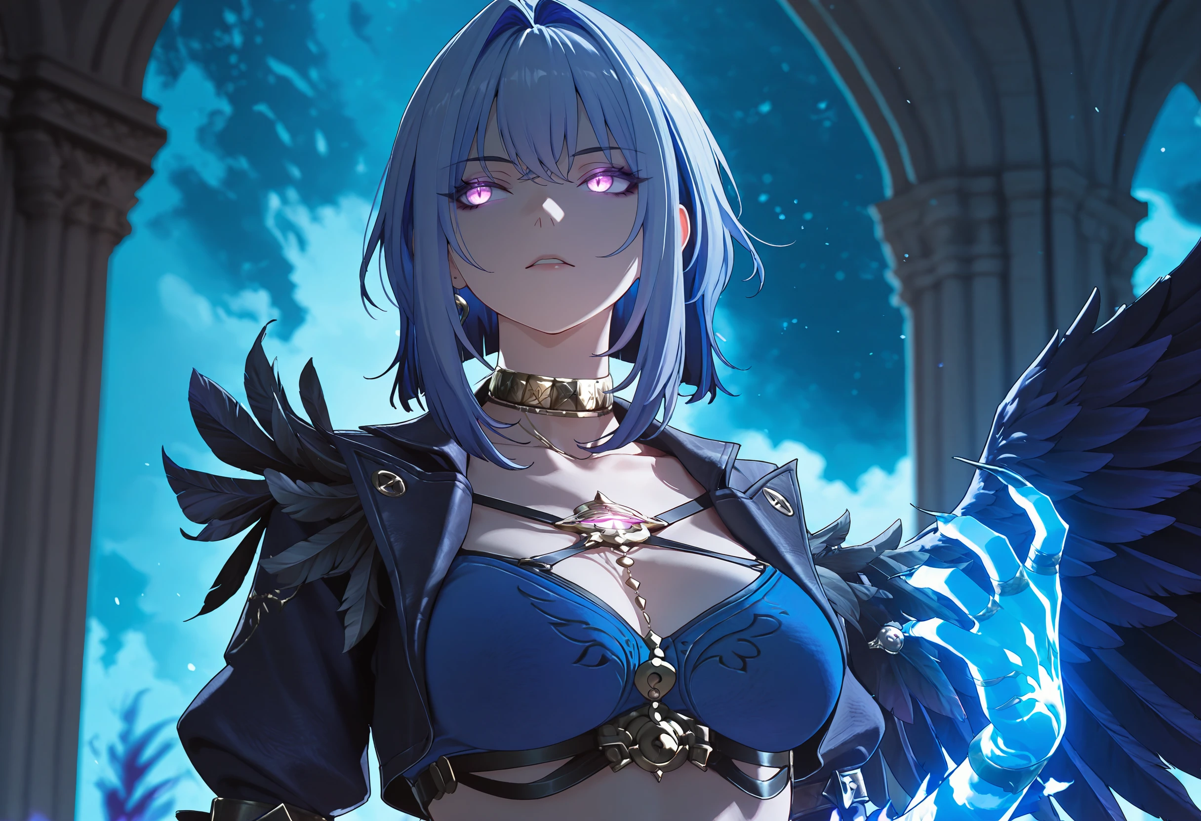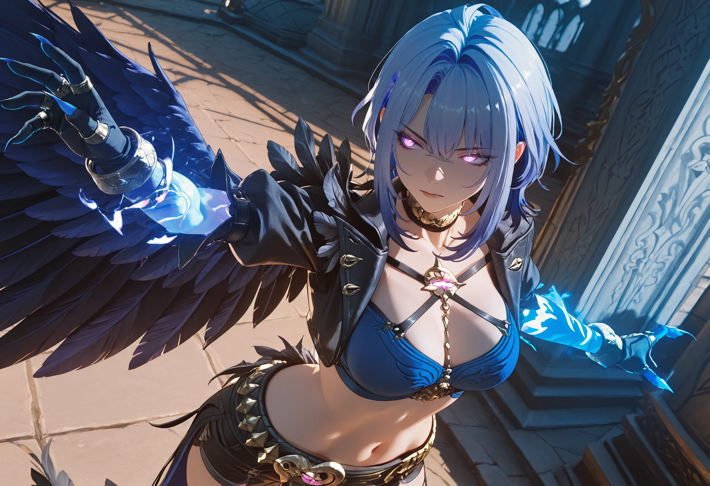 Half demon form: snake earring, gold jewelry, gold choker, cropped jacket, long sleeves, black gloves, claw ring, feather trim, criss-cross halter, blue crop top, snake buckle belt, black skirt, flame hem, black shorts, thigh strap, ring straps, ammo thigh belt (right), asymmetrical legwear, single-leg pantyhose (right), single thighhigh (left), black stiletto boots, blue boots soles, half demon form, single raven wing (right)