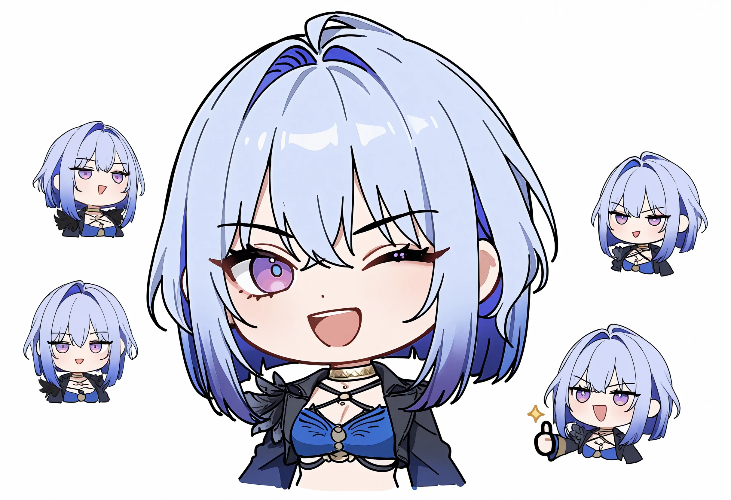 Main tags: galbrena (wuwa), 1girl, lavender eyes, silver-blue hair, short bob, hair highlights, ??????????????, back tattoo, tacet musical symbol
