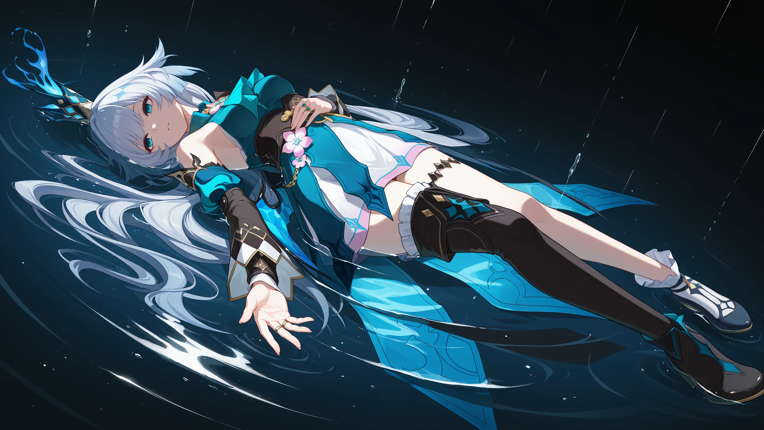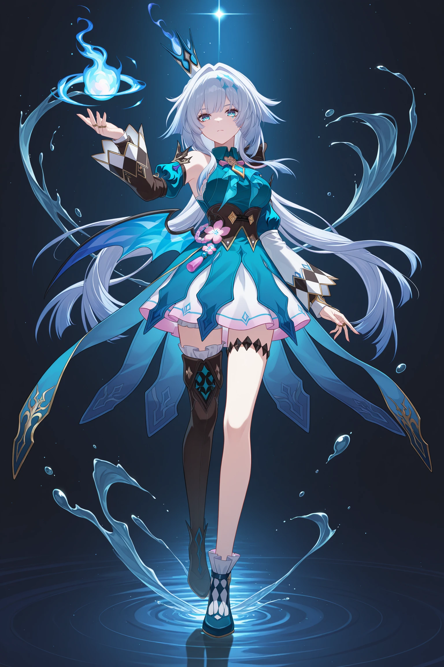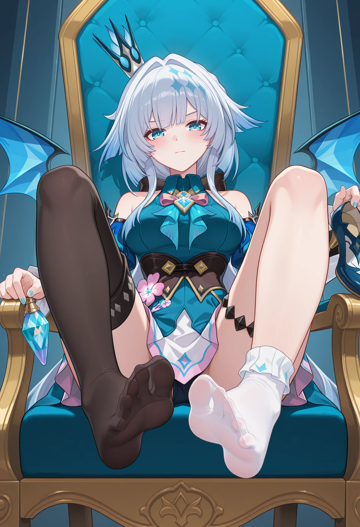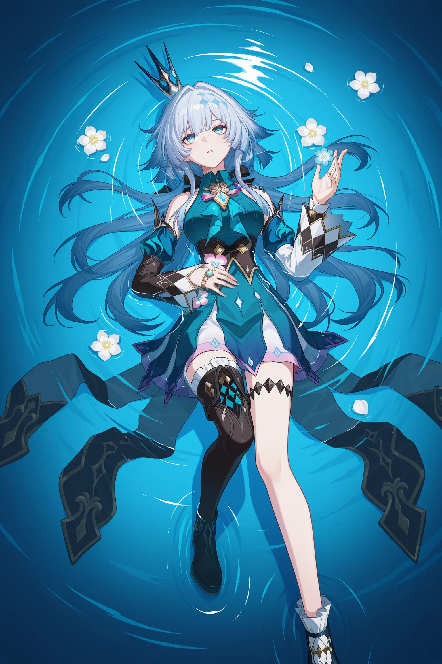 thighhighs,jewelry,long sleeves,black footwear,asymmetrical footwear,black footwear,mini crown,asymmetrical legwear,blue footwear,mismatched footwear,