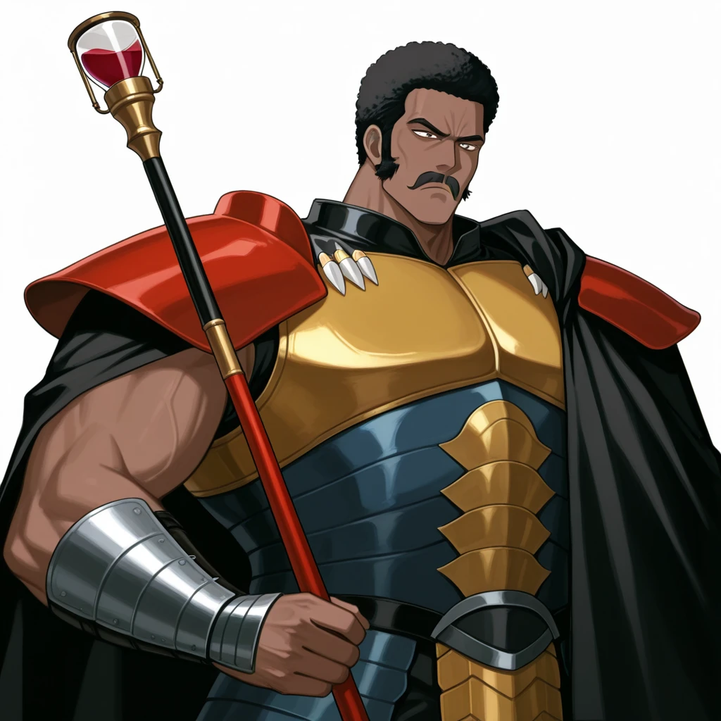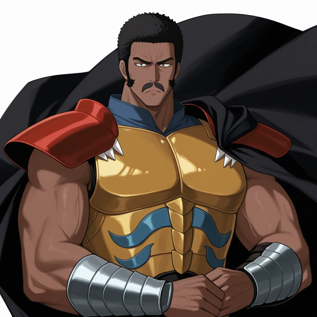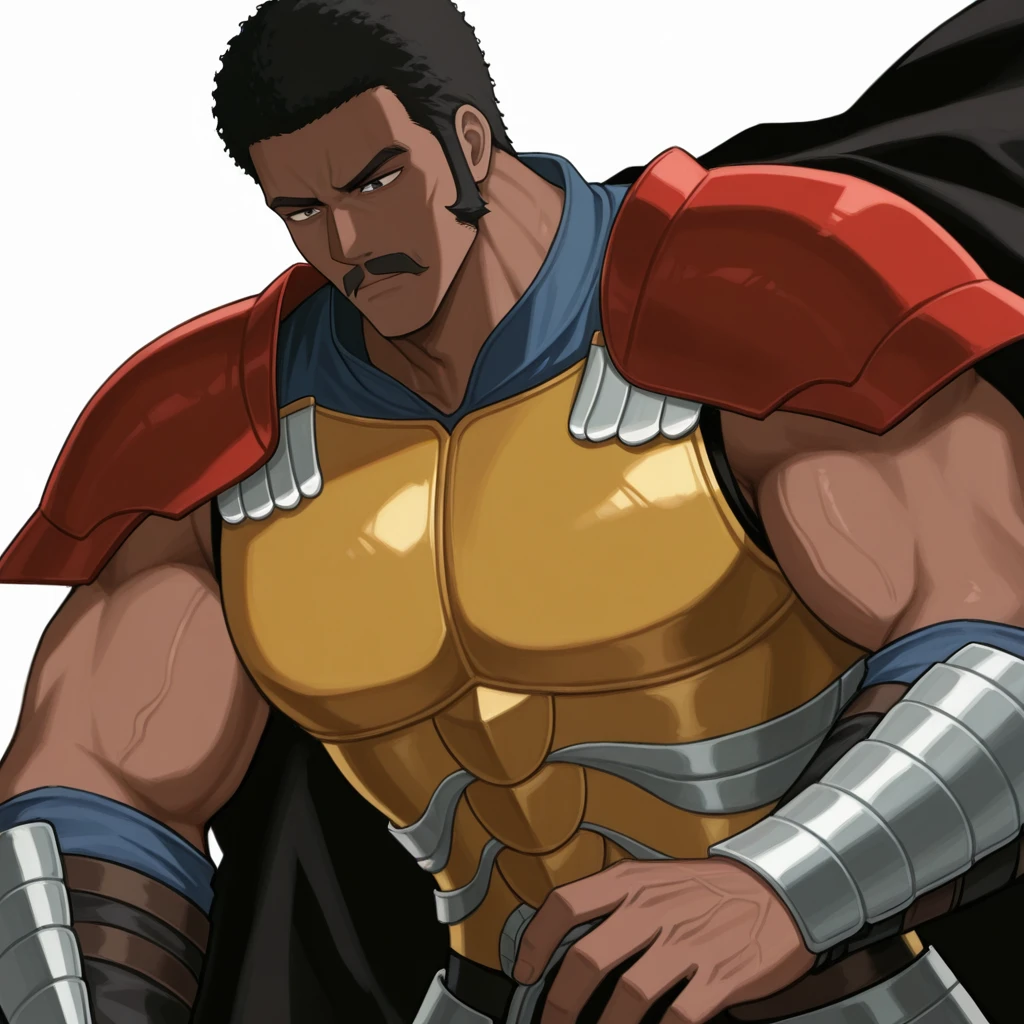 black cape, breastplate, yellow breastplate, red shoulder pads