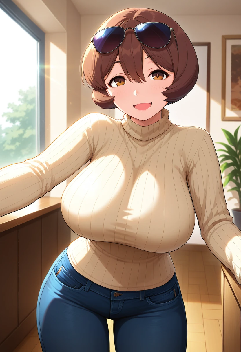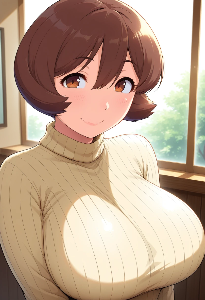 toyookaww, mature female, brown eyes, brown hair, medium hair, hair between eyes, huge breasts,