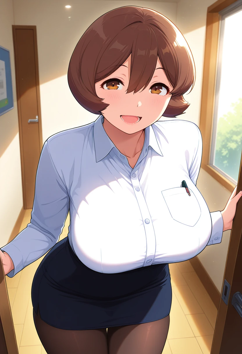 collared shirt, long sleeves, ?????? pocket, pencil skirt, pantyhose,