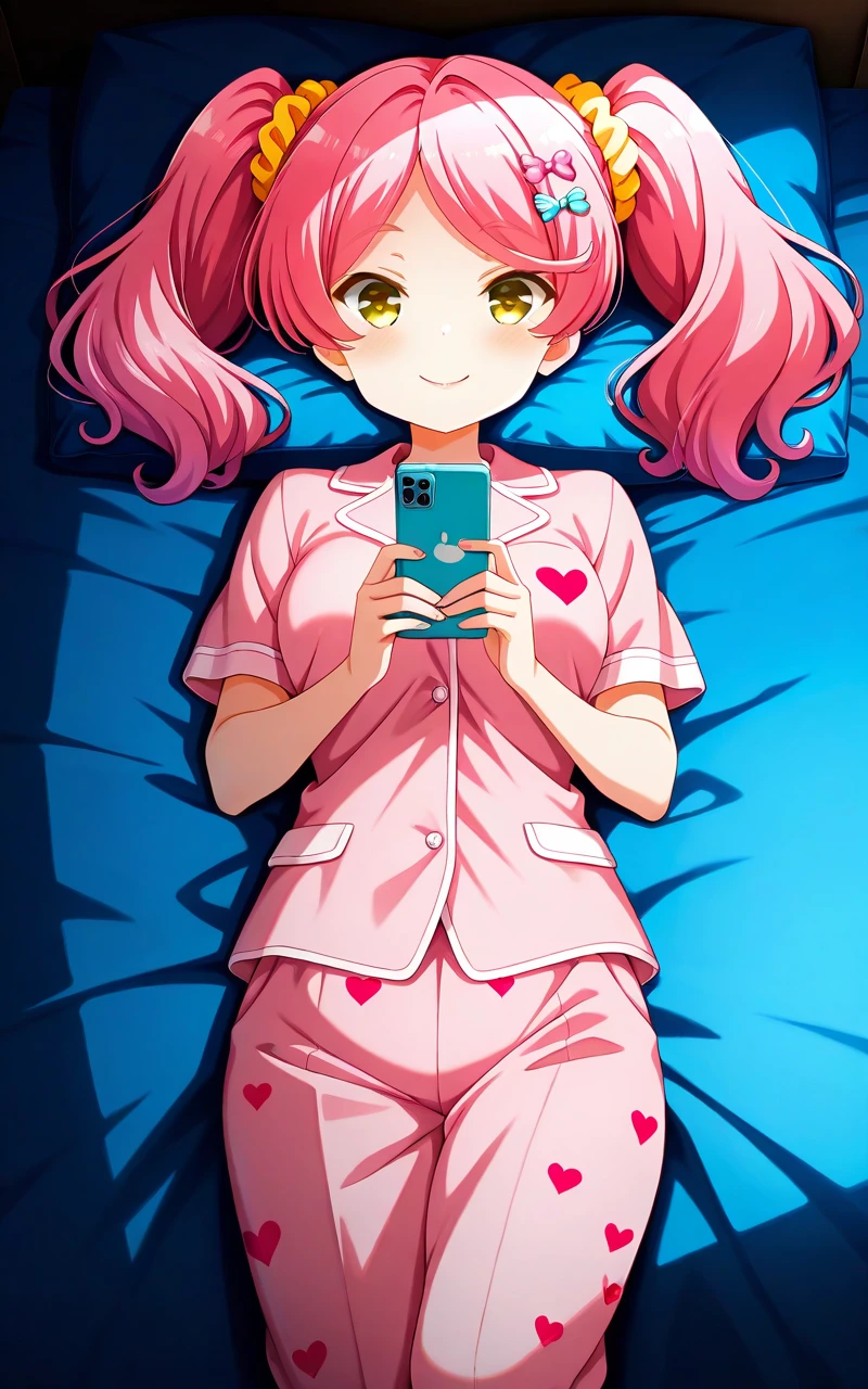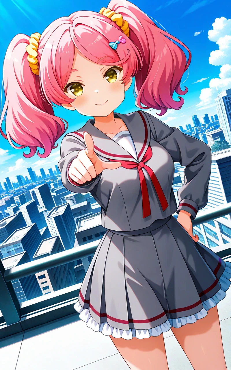 pink hair, twintails, yellow scrunchie, pink scrunchie, blue scrunchie, hair scrunchie, candy hair ornament, parted bangs, long hair, yellow eyes, medium breasts