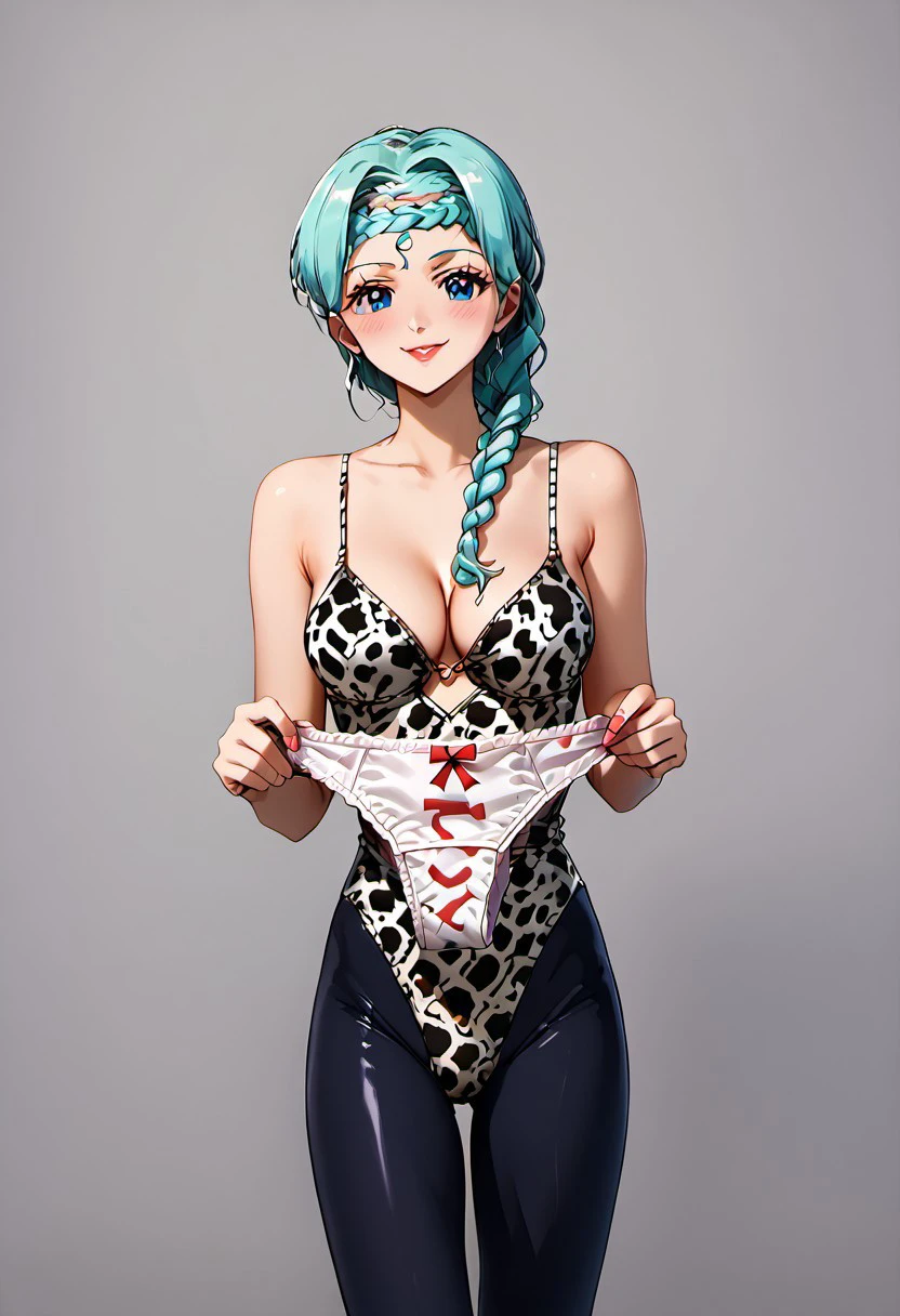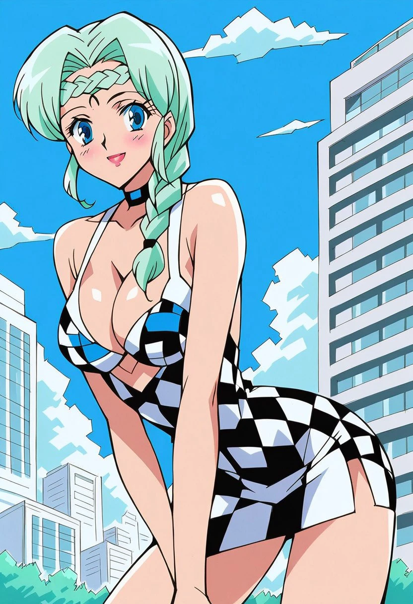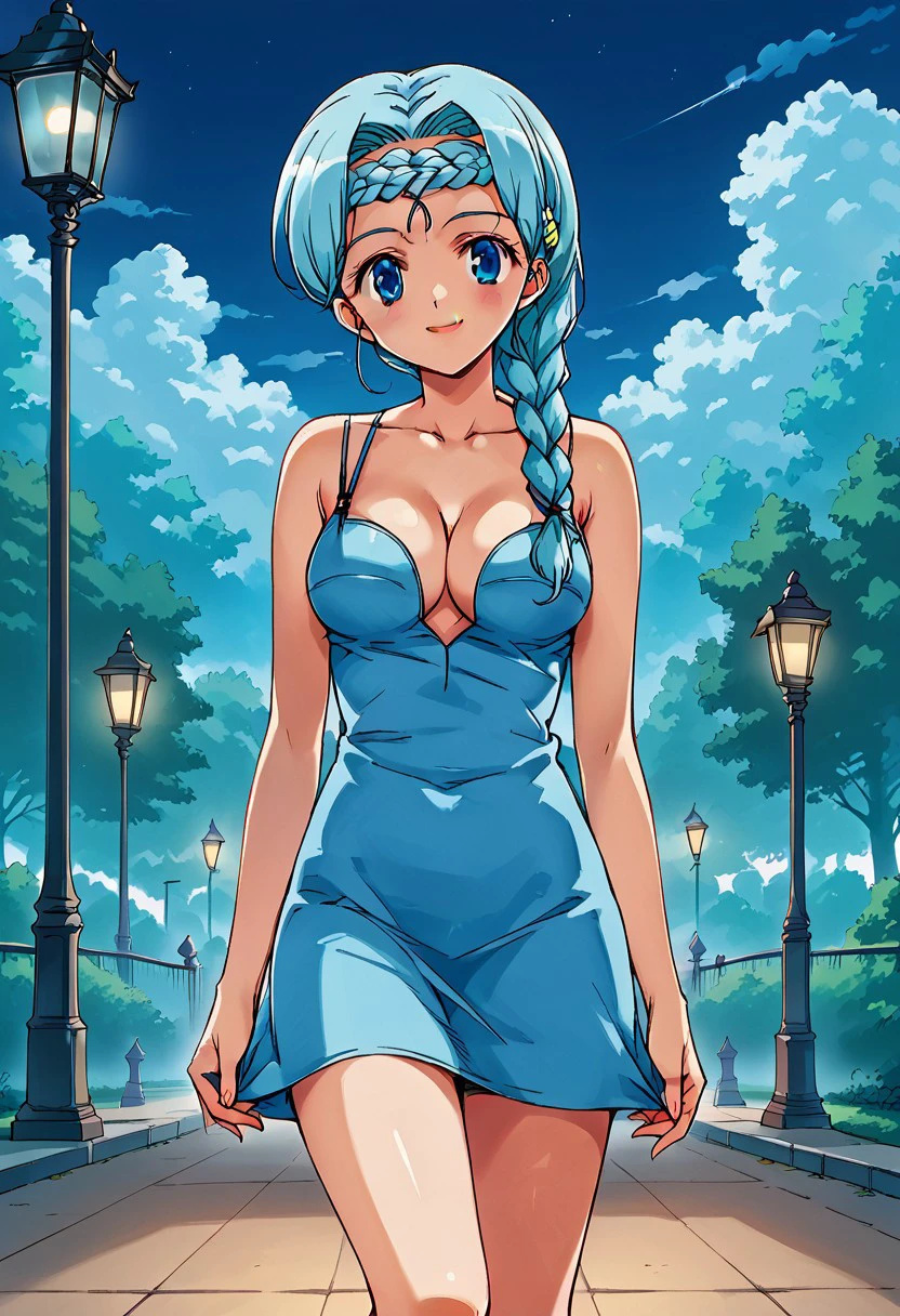 1 girl, pale skin, looking at viewer, feminine, beautiful, cute body, big breasts, shapely legs, makeup, blue eyes, ultra-detailed pupils, blue eyelids, red lips, rosy cheeks, very light makeup, crescent moon on forehead, black crescent moon, jewelry, choker, black crystal earrings, (((aquamarine hair, braid, bangs braided to the right AND left, long hair)))