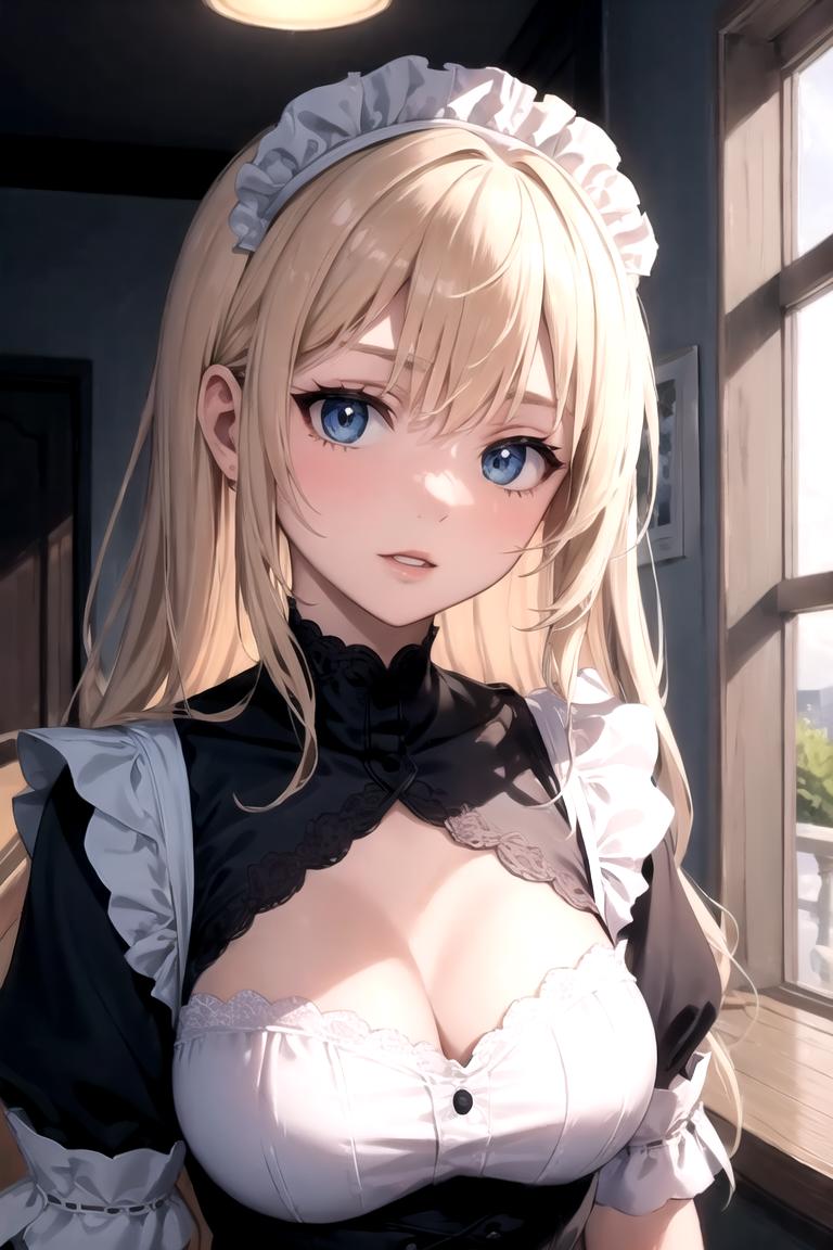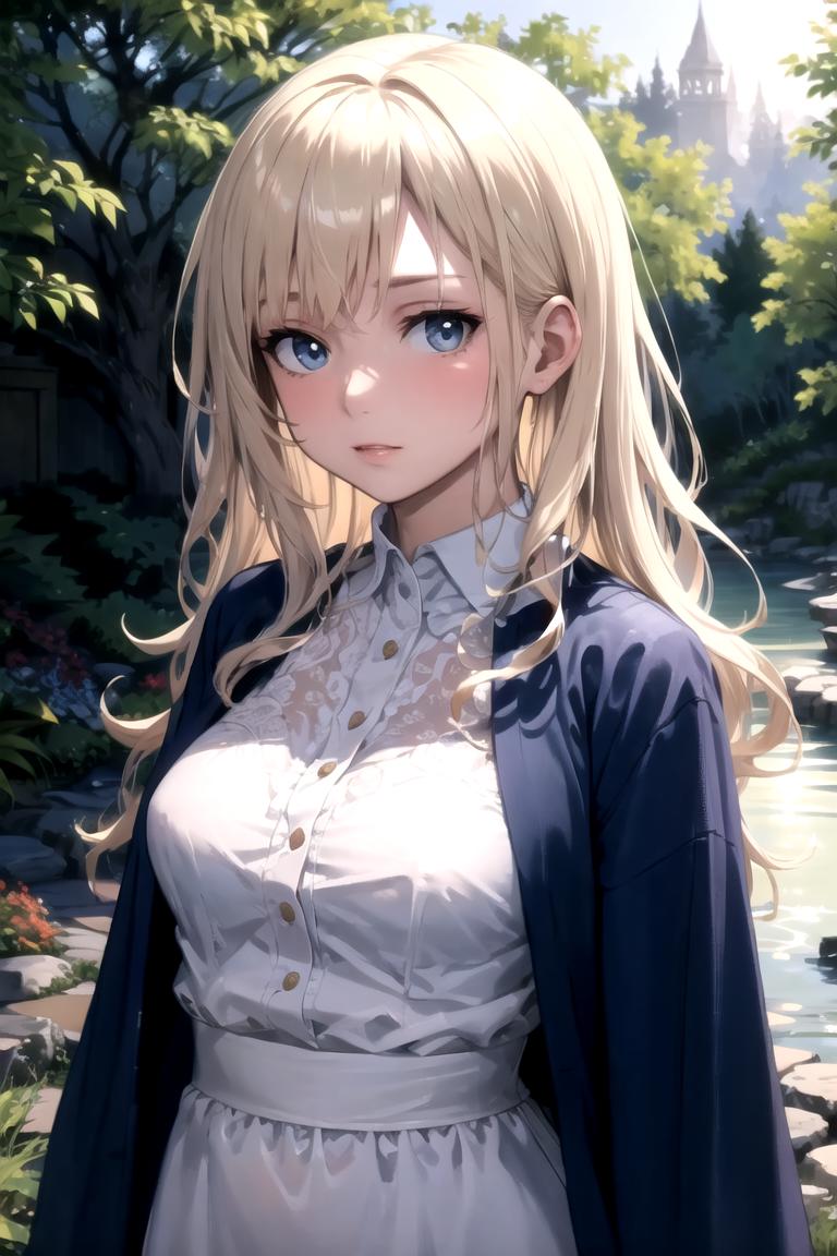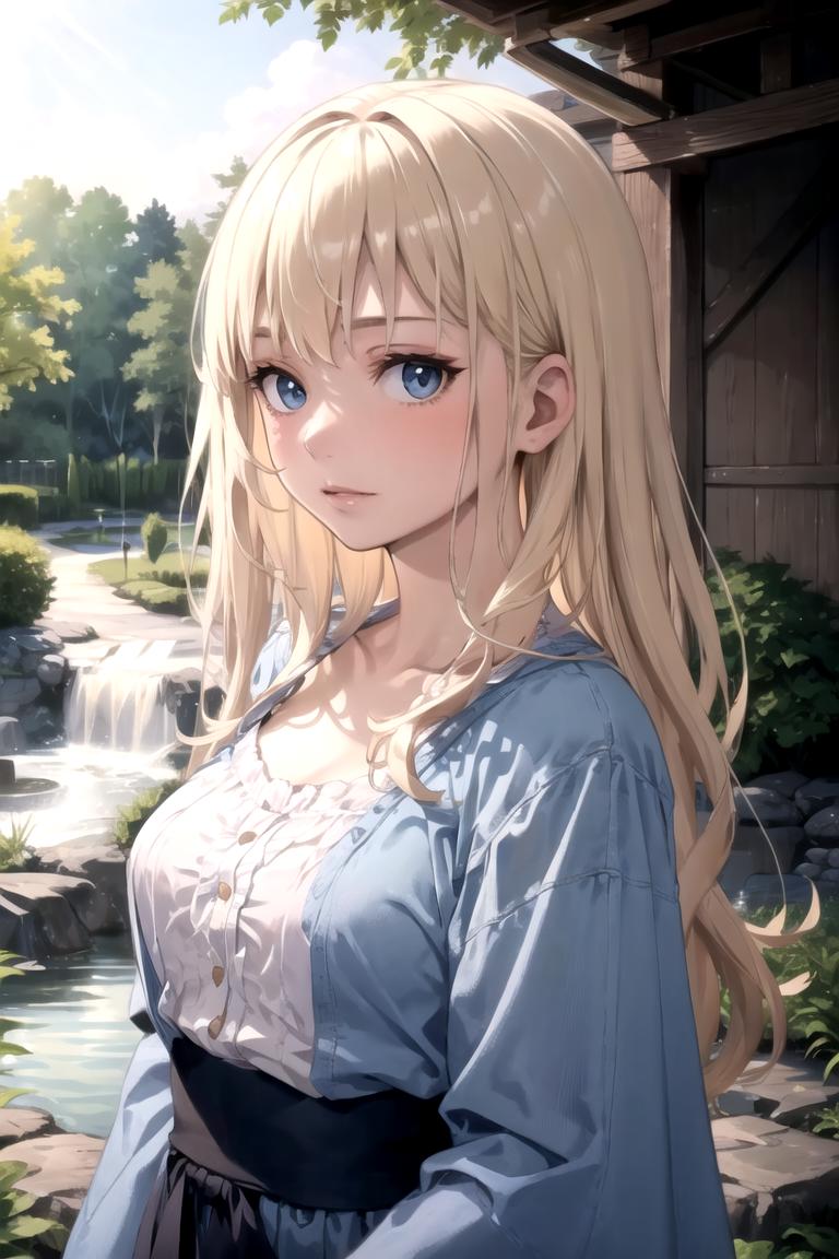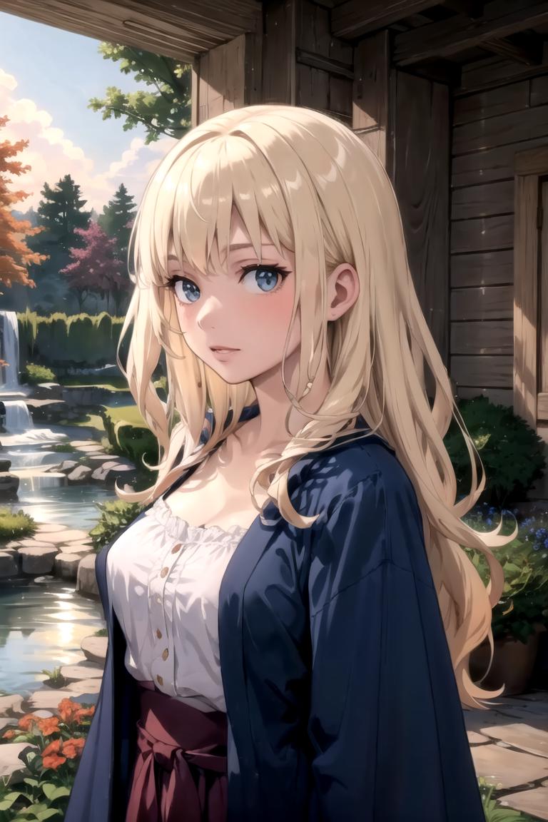 This lora is trained on images that were AI generated with prompts we normally use to make this character. Those prompts are "female with long wavy platinum blonde hair wearing a blue cloak and a chemise" and "Grey eyes, blue robe, platinum blonde hair, long hair, corset, belt, holding staff".