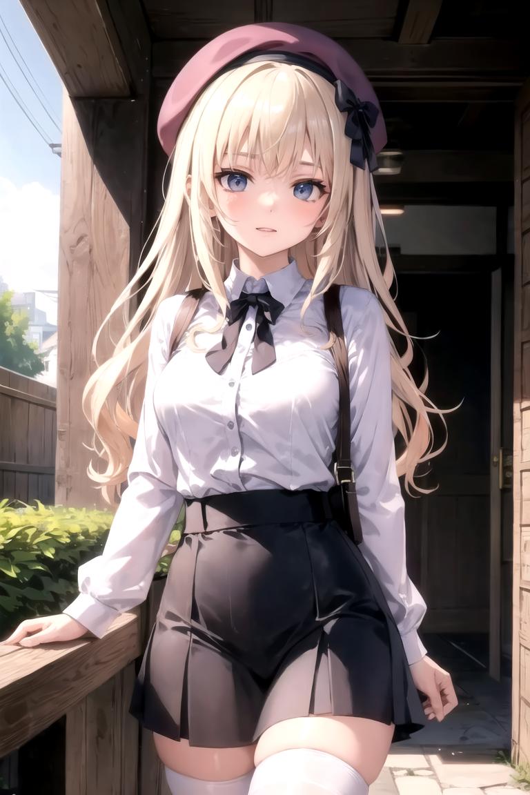 Example prompt 1: seraphina, solo, skirt, shirt, long sleeves, dress, closed mouth, thighs, belt, wide sleeves, corset, side slit, holding staff