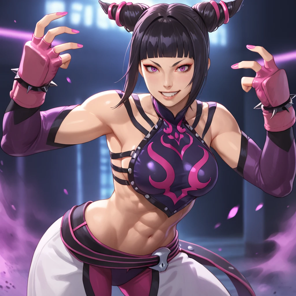 Trigger 2: jurihan, 1girl, hair horns, han juri, fingerless gloves, navel, black hair, spiked bracelet, detached sleeves, spikes, breasts, toned, midriff, halterneck, abs, purple eyes, bare shoulders, chinese clothes, nail polish, blunt bangs, jewelry, pants, pink nails
