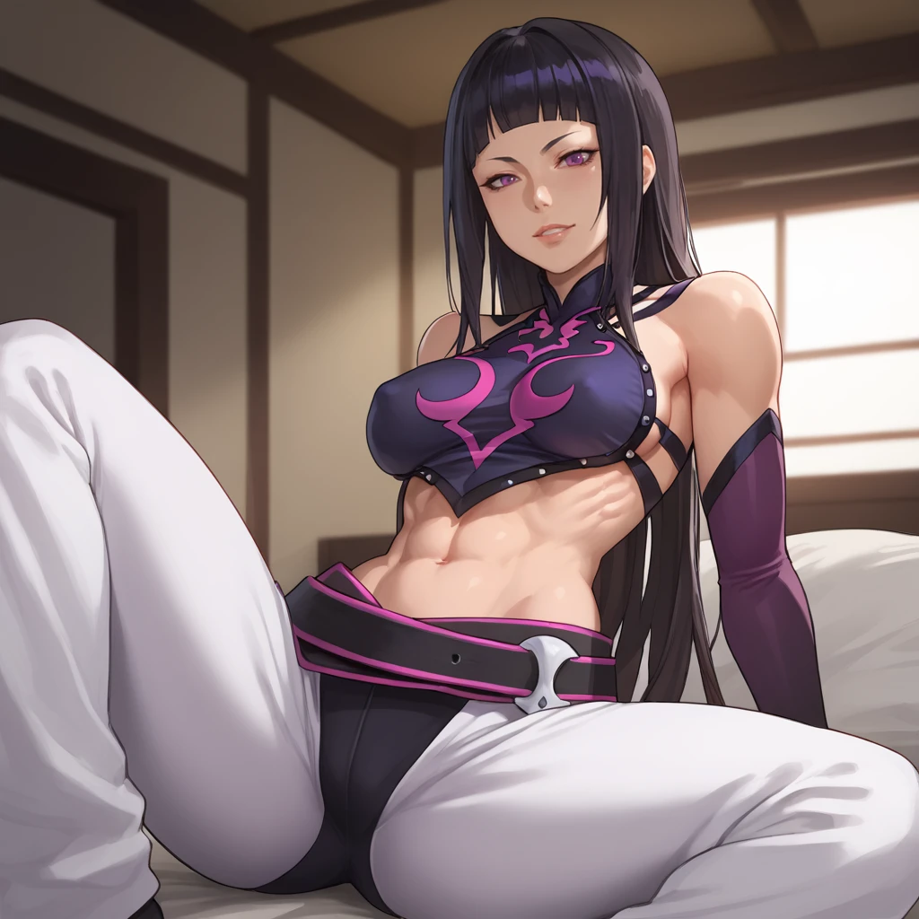 Trigger with long hair: jurihanlonghair, 1girl, solo, han juri, dudou, navel, long hair, black hair, fingerless gloves, hair down, alternate hairstyle, baggy pants, toned, detached sleeves, purple eyes, belt, abs, halterneck, midriff, ribs, blunt bangs, chinese clothes, breasts, bare shoulders, cowboy shot