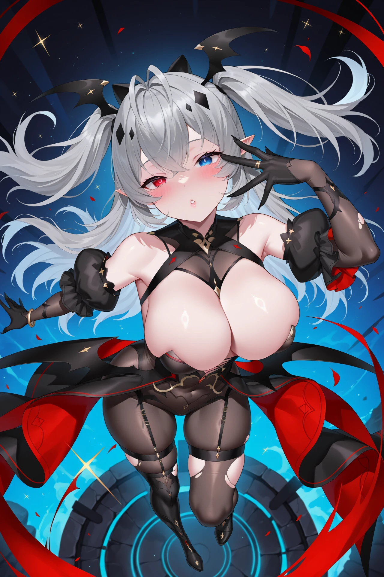 gnosisbeth, 1girl, breasts, grey hair, heterochromia, red eyes, large breasts, smile, solo, long hair, grey eyes, bracelet, looking at viewer, dress, cleavage, black dress, two side up, jewelry, detached sleeves, pointy ears, bare shoulders, hair ornament, closed mouth