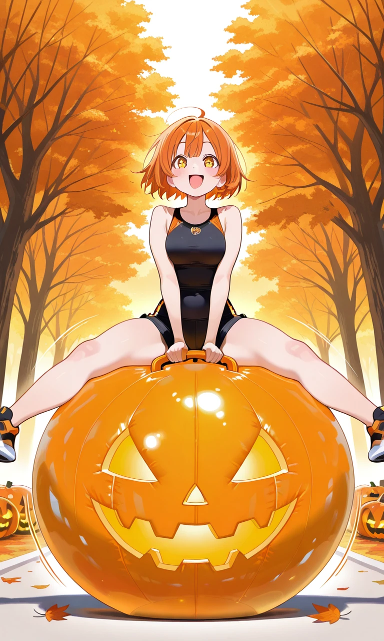 big hopper ball, big jack-o'-lantern, big bouncy ball, riding big hopper ball, riding big jack-o'-lantern, big inflatable ball, big handles yoga ball, grabbing yoga ball handle, handle between legs, sitting on big jack-o'-lantern, wide handle,