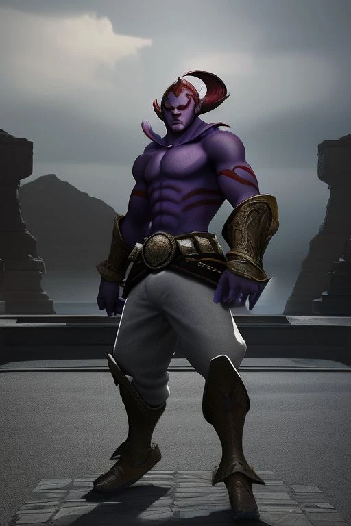 Erazor Djinn, light purple skin, cardinal red hair, black sclera, red pupils, muscular, long brown cape, gold armbands, baggy white pants