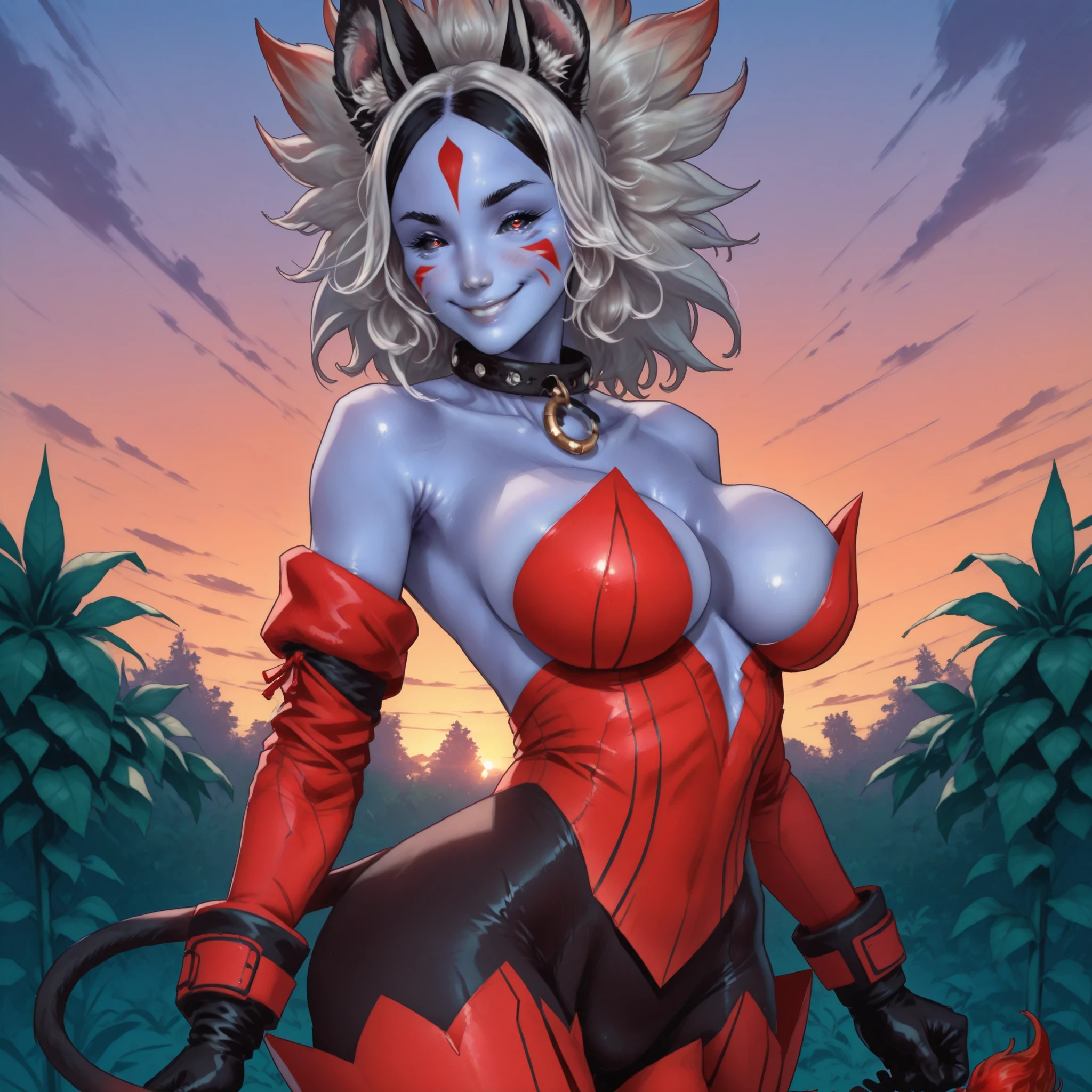 LamashtuBS, colored skin, blue skin, facial mark, black sclera, long hair, white hair, animal ears, choker, red suit, gloves, tail, thigh boots