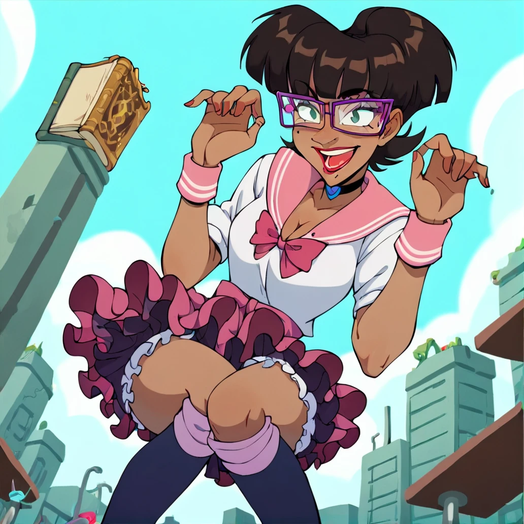 nora rita norita, mole under eye, 1girl, solo, brown hair, short hair, green eyes, purple glasses, dark-skinned female, narrow waist, dark skin, mole under eye