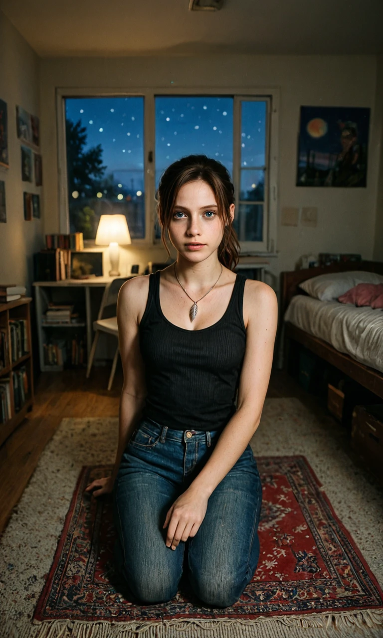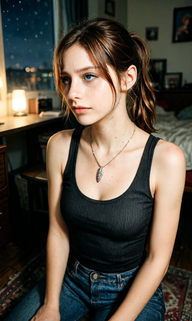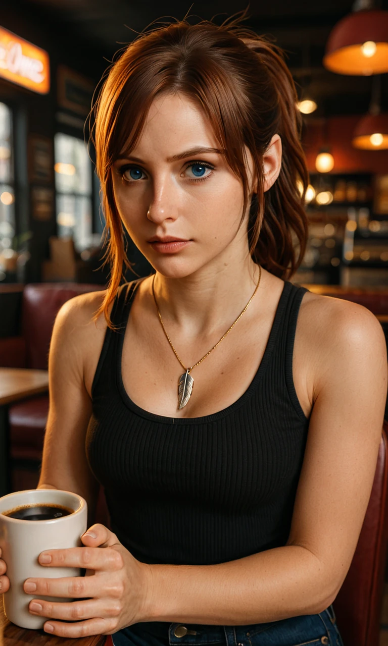 claire redfield, brown hair, blue eyes, parted bangs, ponytail, brown hair, bare shoulders, feather necklace, dark tank top, jeans
