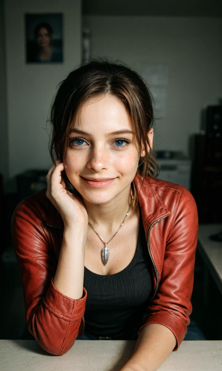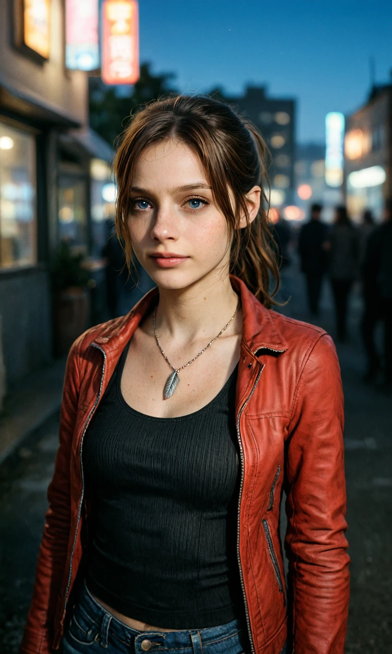 claire redfield, brown hair, blue eyes, parted bangs, ponytail, brown hair, red jacket, feather necklace, dark tank top, jeans