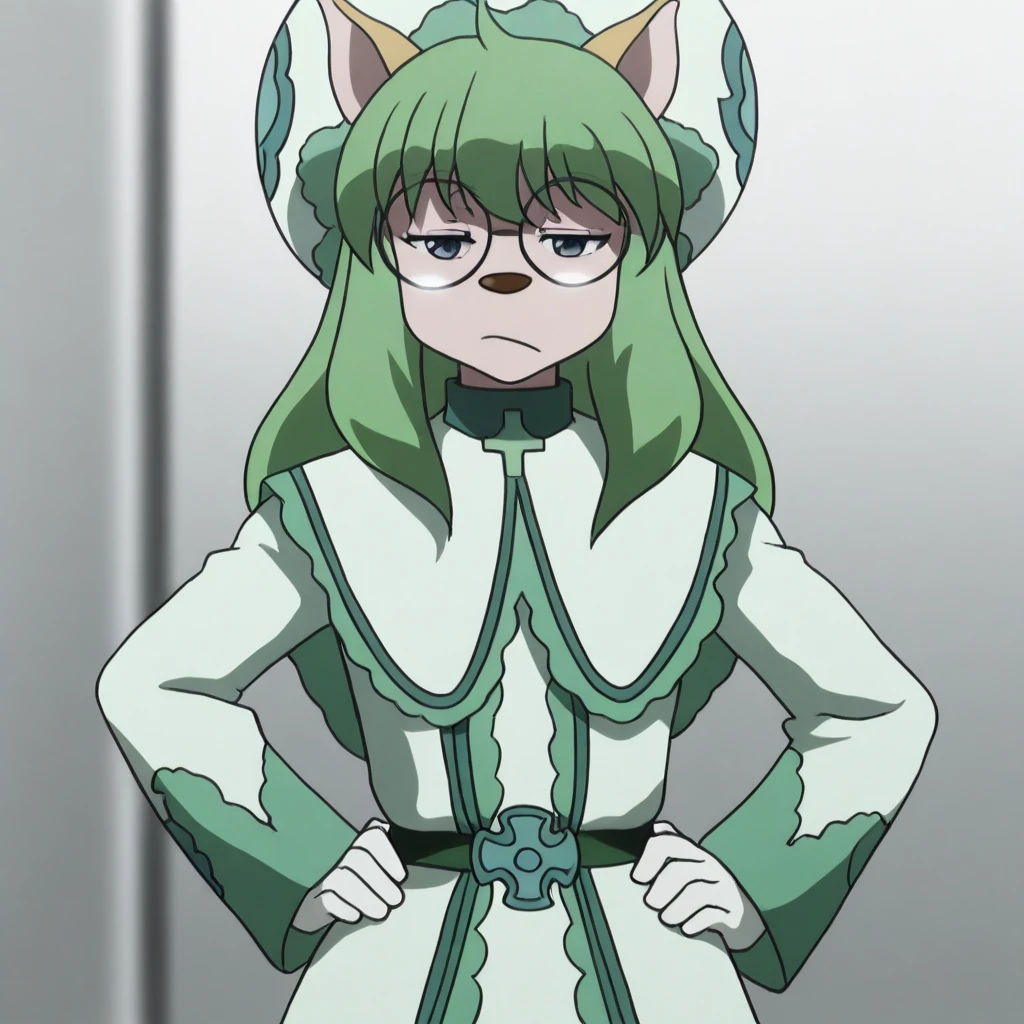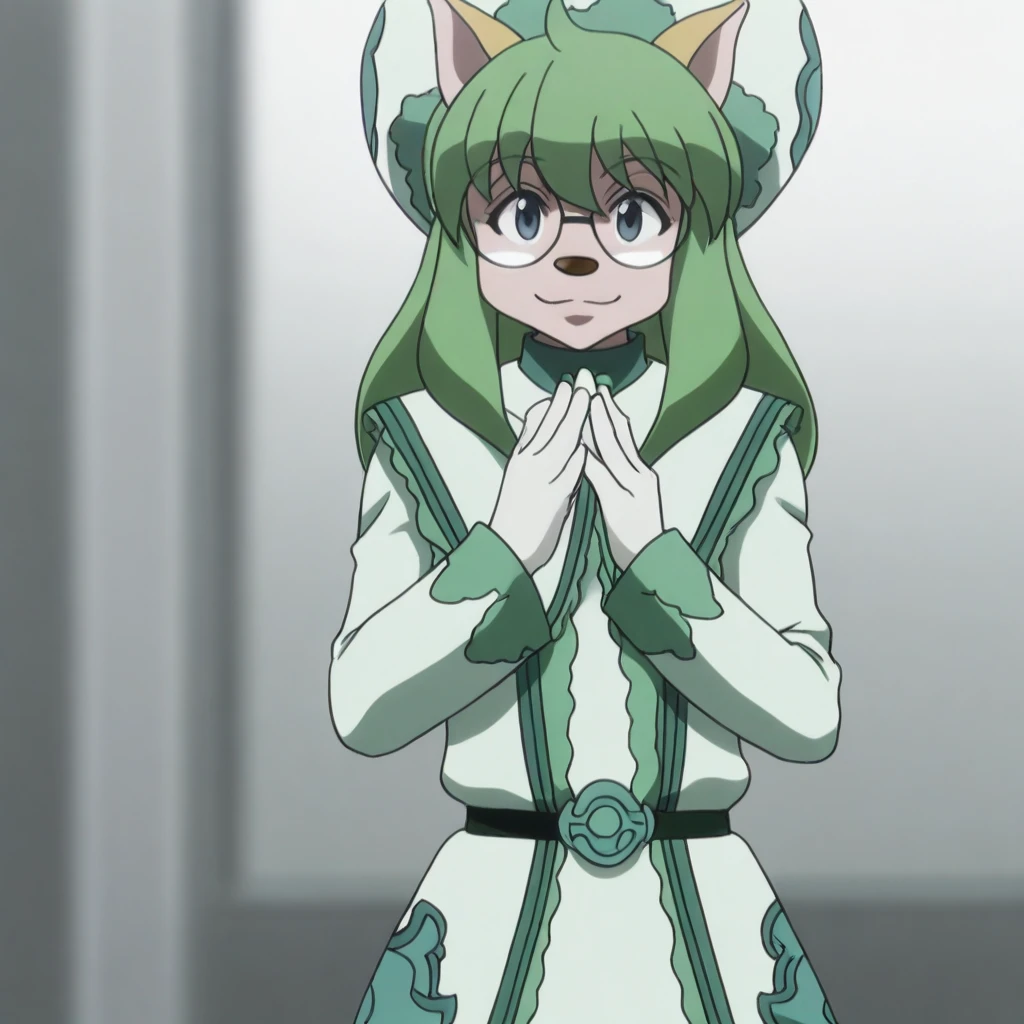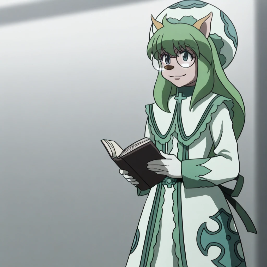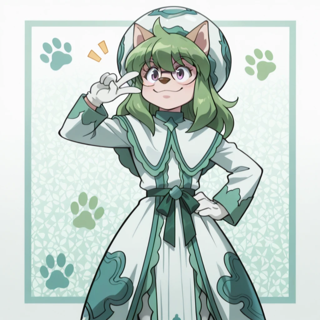 dog female, solo, light skin, light brown ears, long green hair, silver eyes, round black glasses, brown nose, round extravagant hat with light green accents, extravagant white dress with green accents, white capelet with green accents, white gloves, white leggings, light green trim, dark green ribbon around waist,