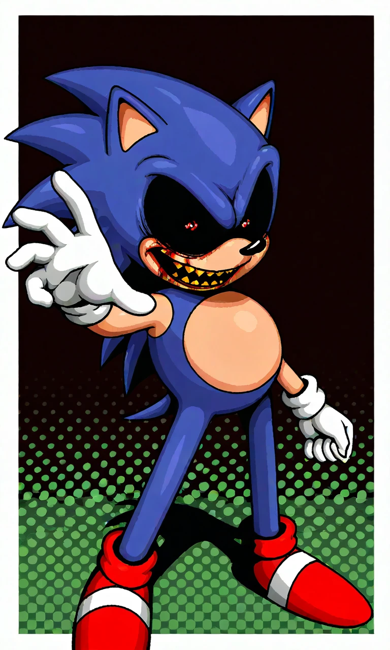 CDXexe, 1boy, red eyes, black sclera, yellow teeth, slightly darker blue fur, white glove, red shoes, sonic the hedgehog, horror