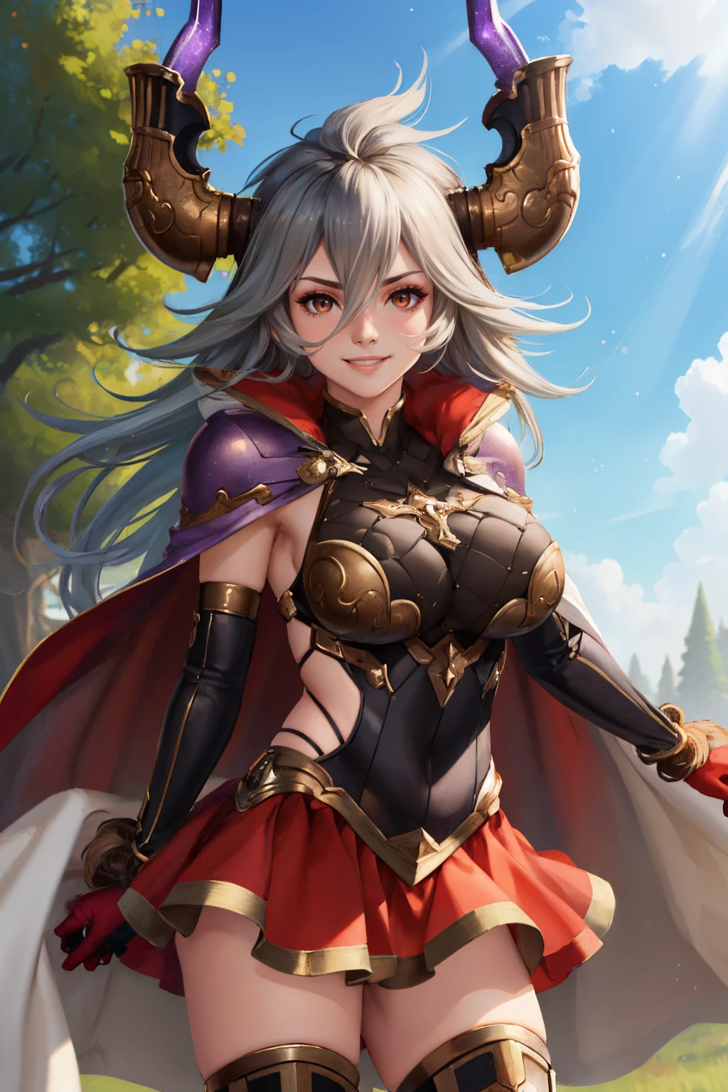 Default Outfit: armor, cape, red skirt, thighhighs, black gloves, elbow gloves