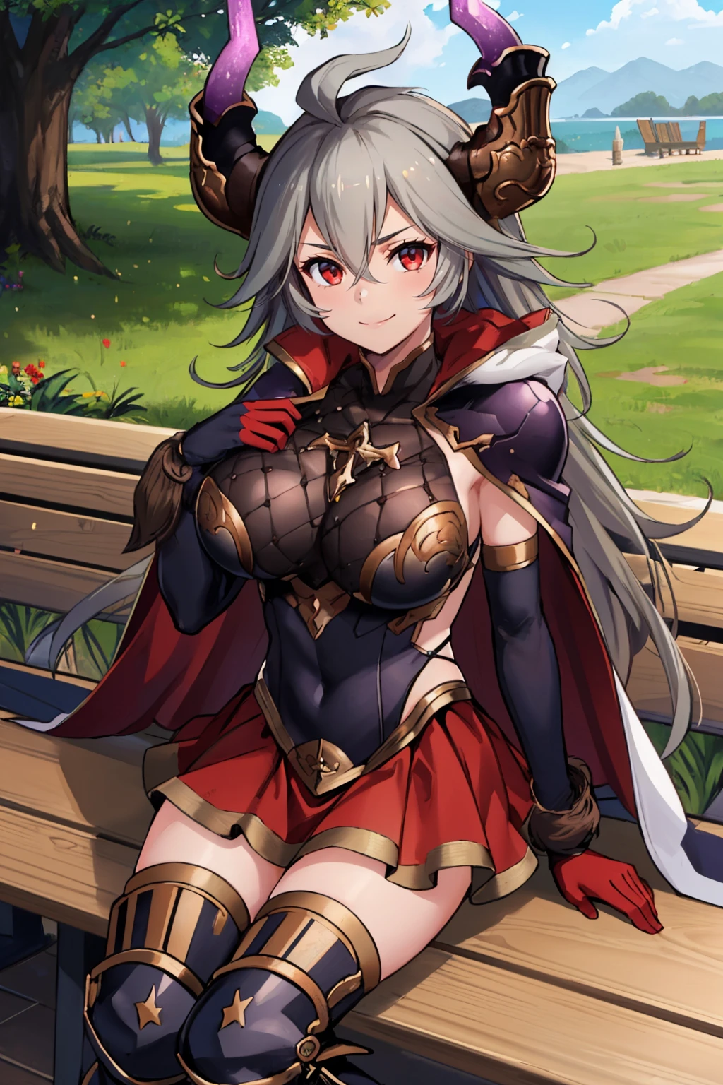 armor, cape, red skirt, thighhighs, black gloves, elbow gloves