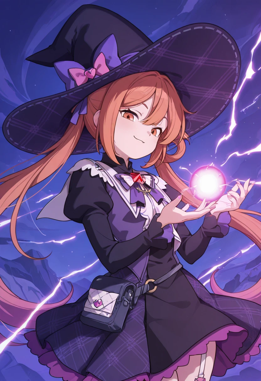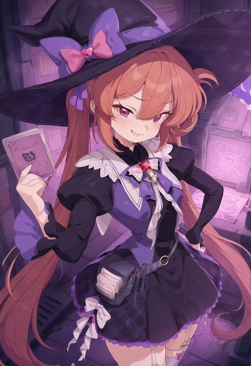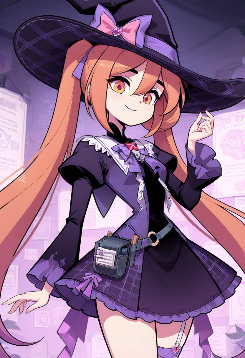 zzMistique, orange eyes, orange hair, hair between eyes, long hair, twintails, witch, black dress, frilled dress, pink bow, purple bow, juliet sleeves, puffy sleeves, garter straps, witch hat, brooch,