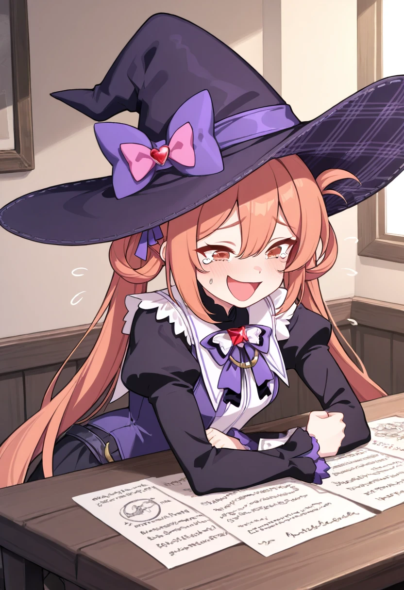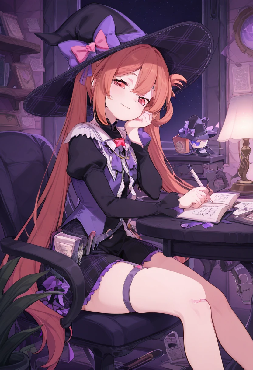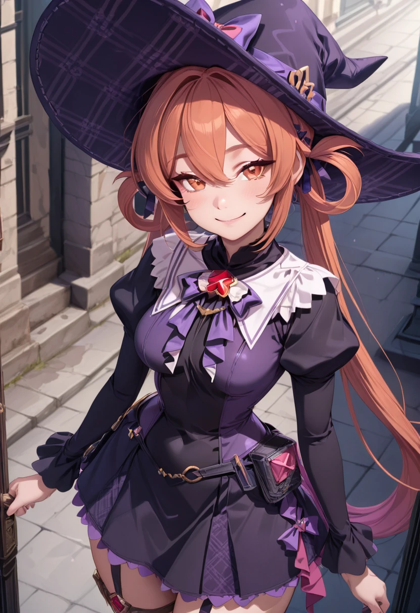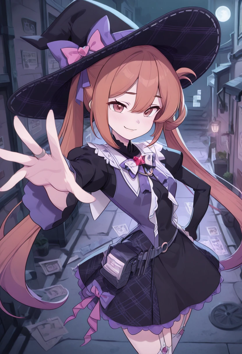 zzMistique, orange eyes, orange hair, hair between eyes, long hair, twintails, witch, black dress, frilled dress, pink bow, purple bow, juliet sleeves, puffy sleeves, garter straps, witch hat, brooch,