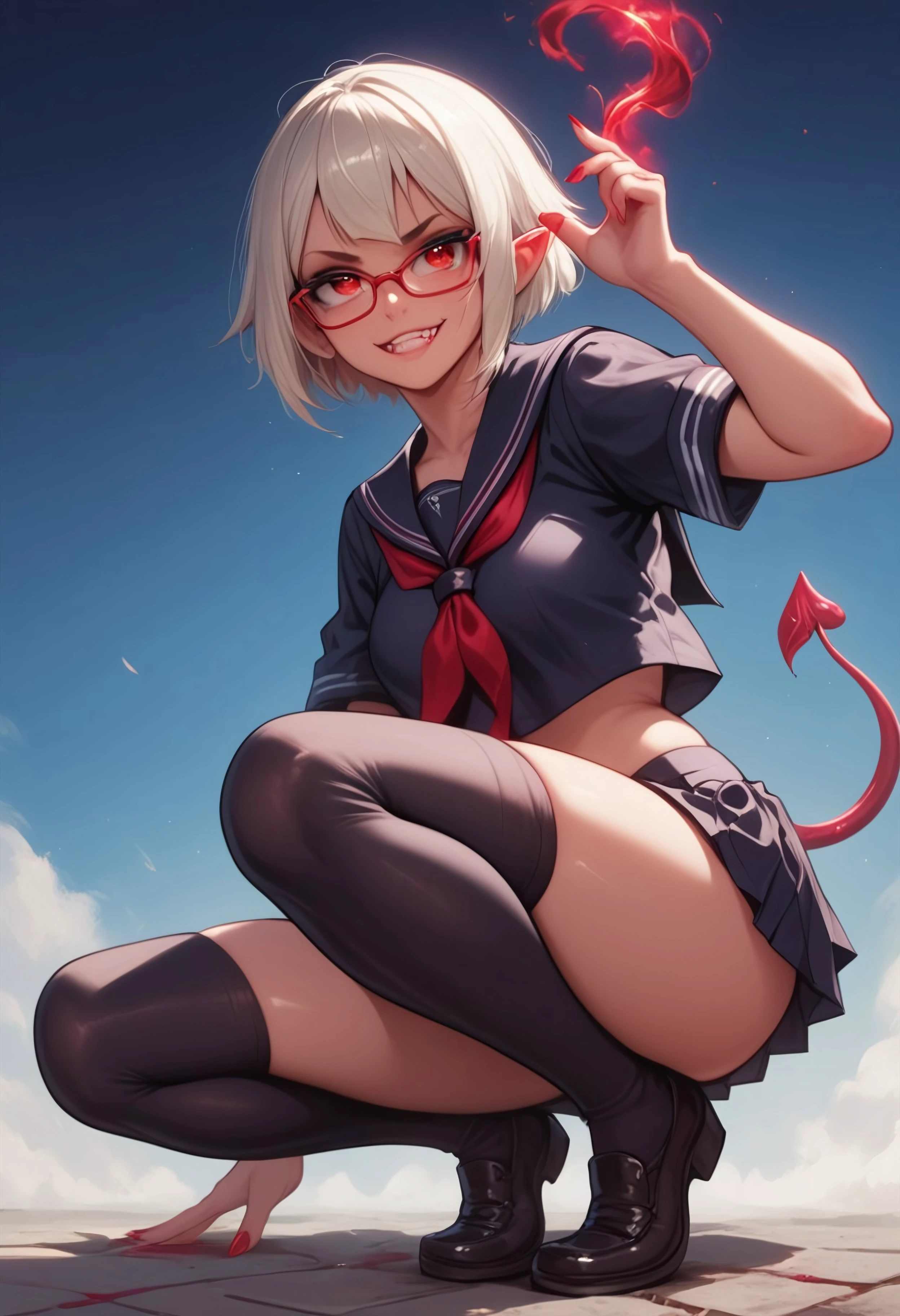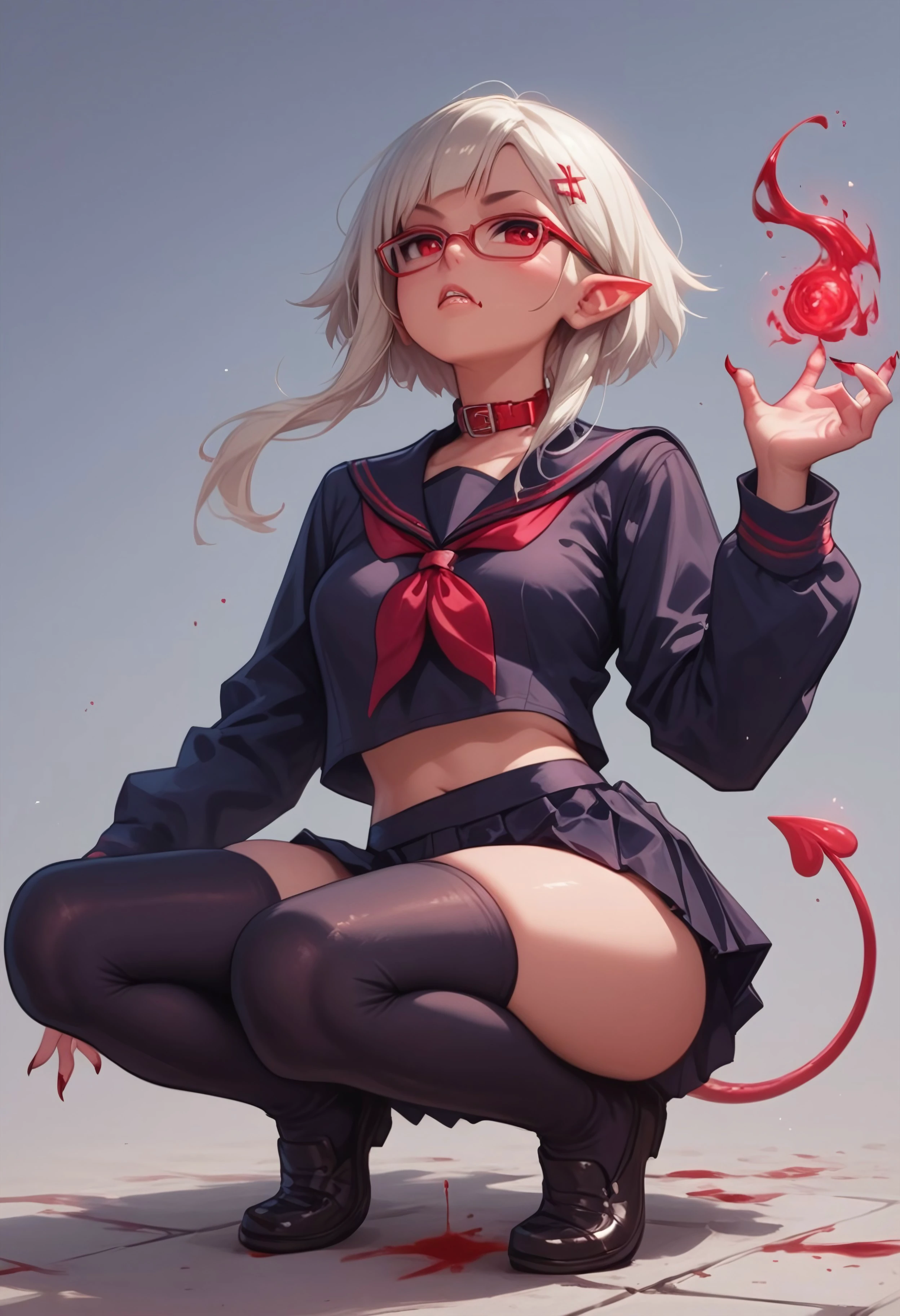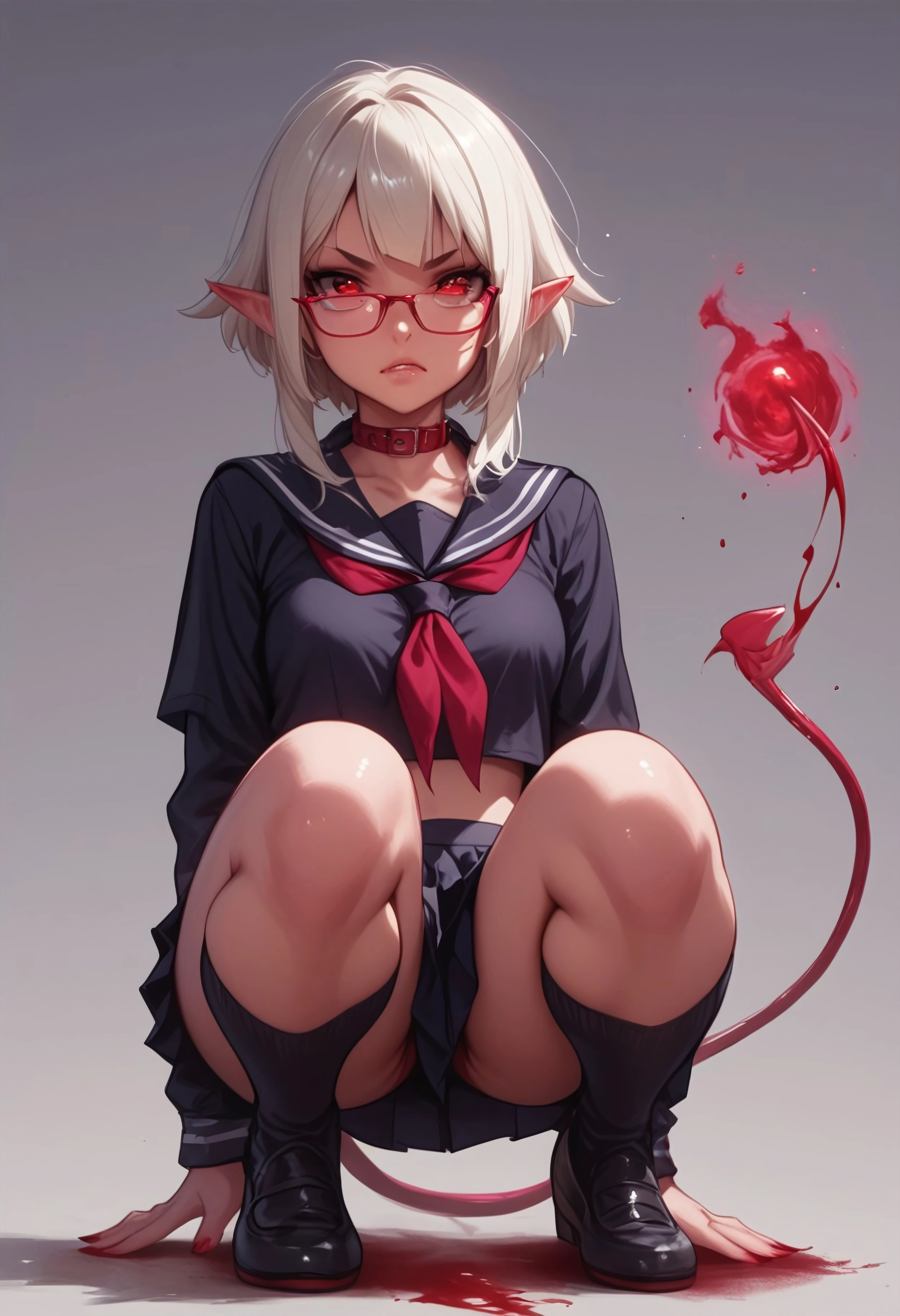 Specialized Tags: elf ears, school girl, succubus, short hair, red eyes, platinum blonde hair.