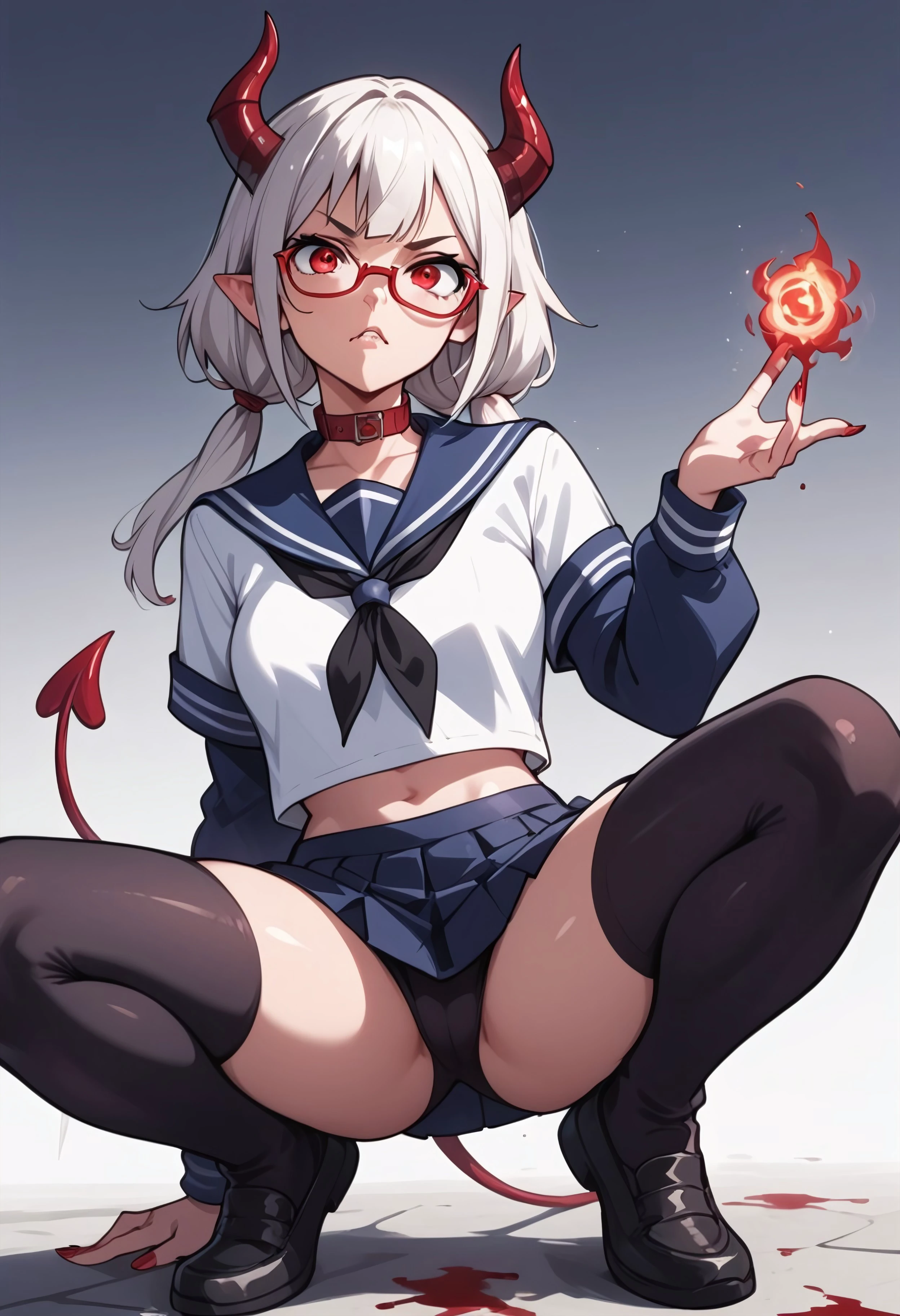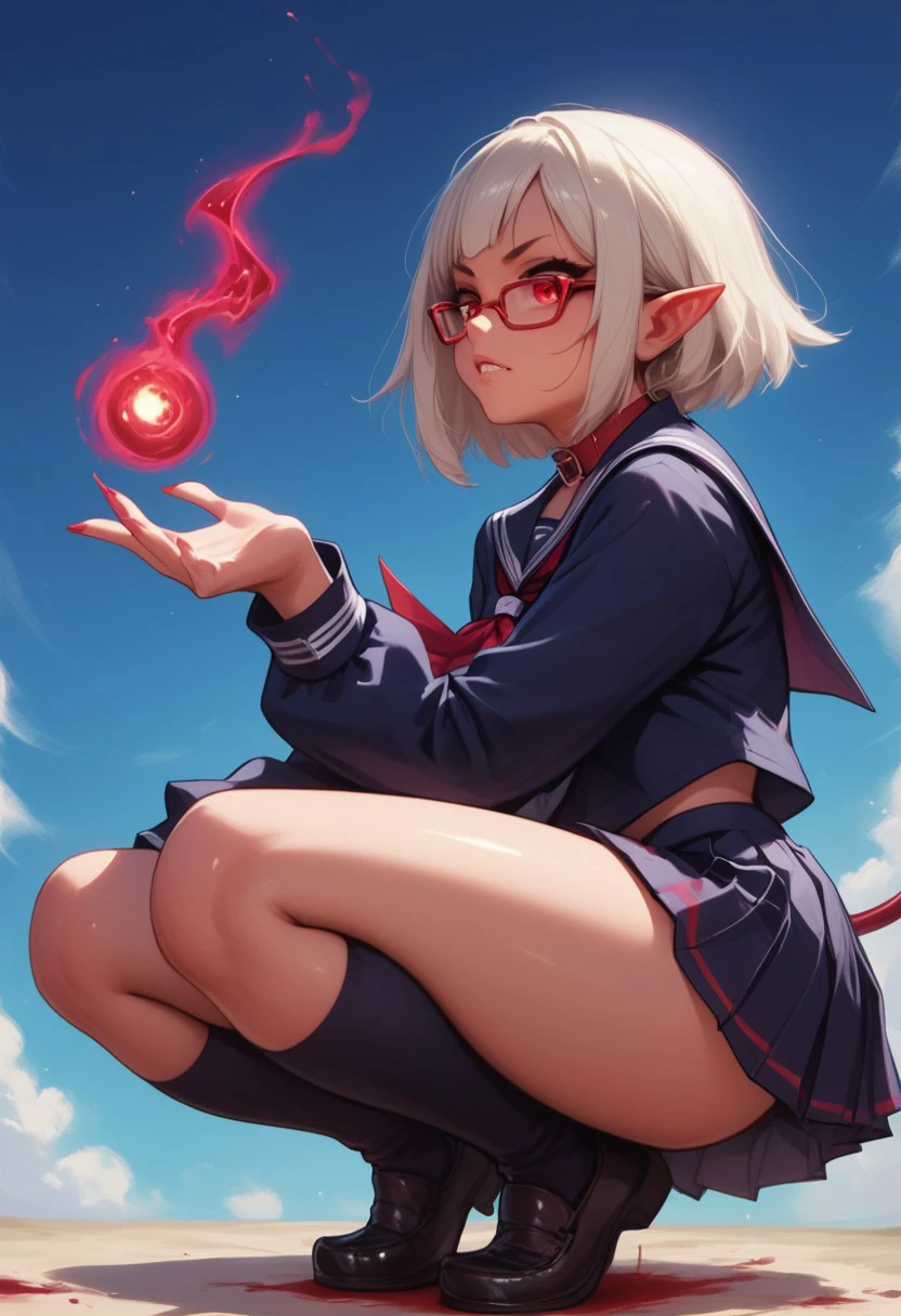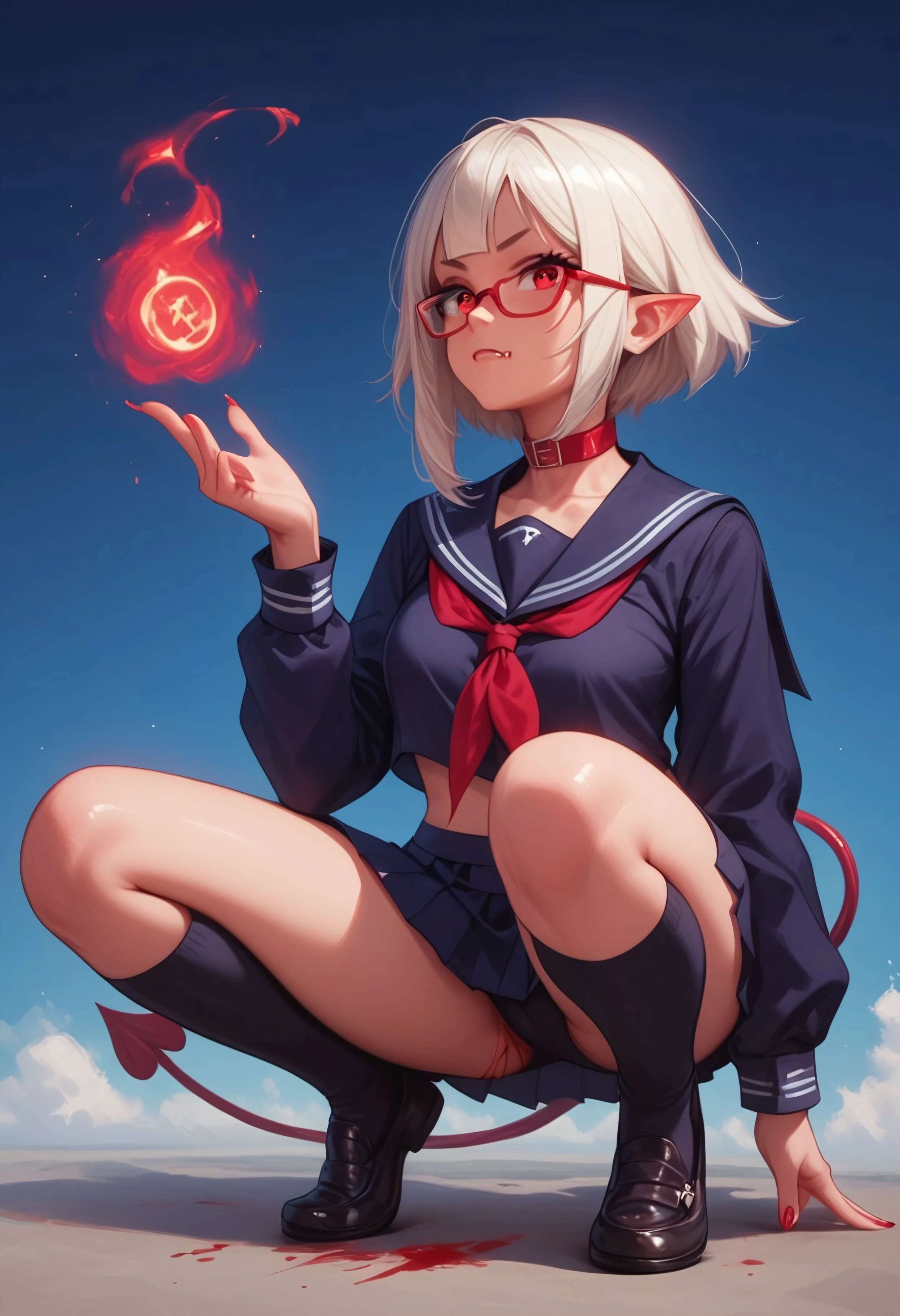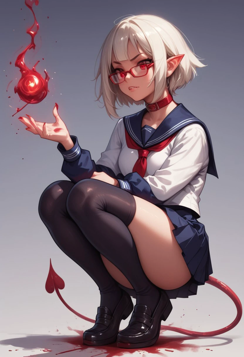 Specialized Tags: elf ears, school girl, succubus, short hair, red eyes, platinum blonde hair.