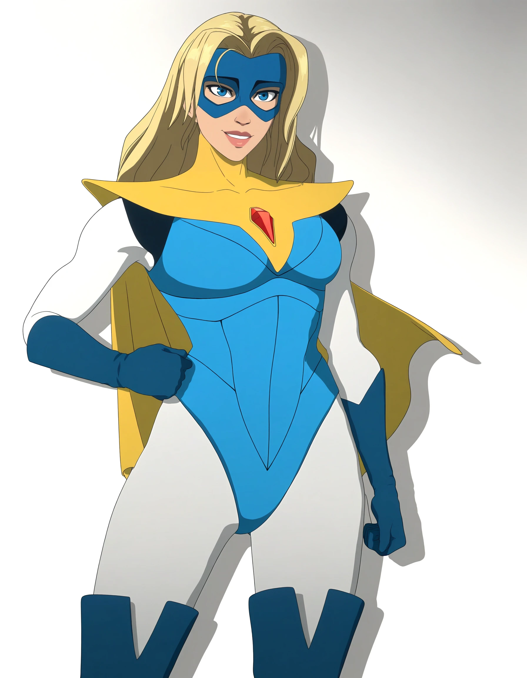 domino mask, blue mask, s8p3h3r0_outfit, yellow cape, red gem, chest jewel, blue gloves, thigh boots,