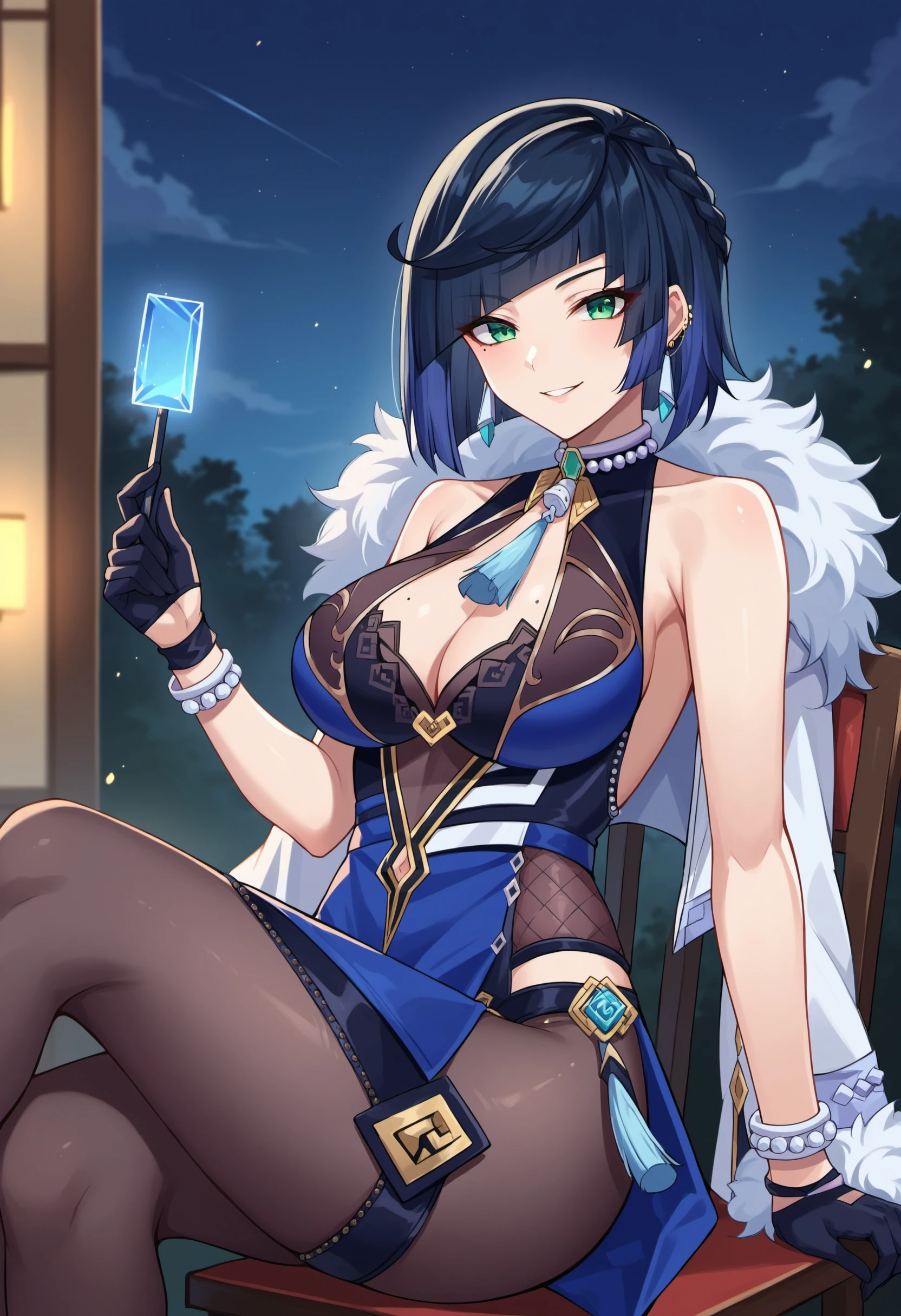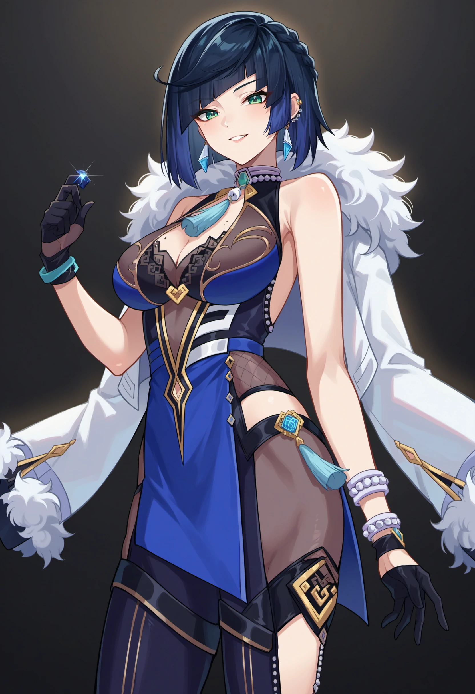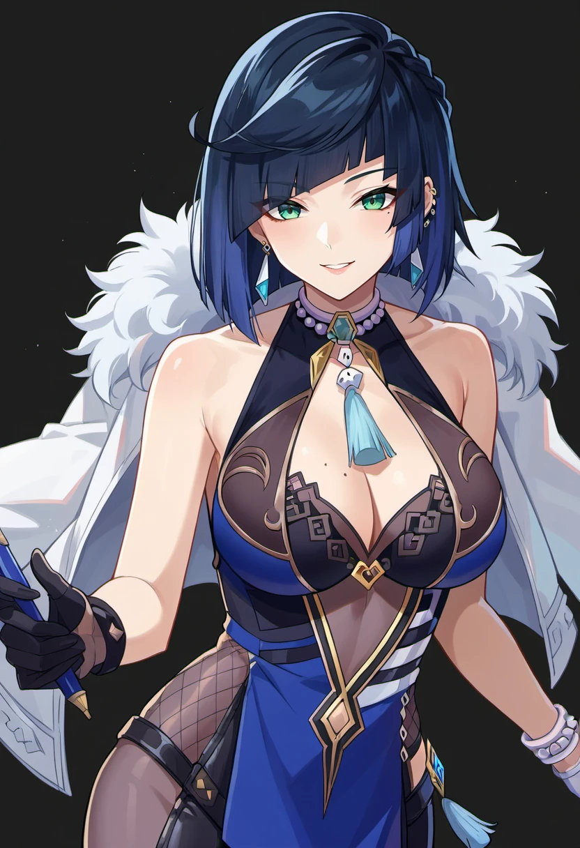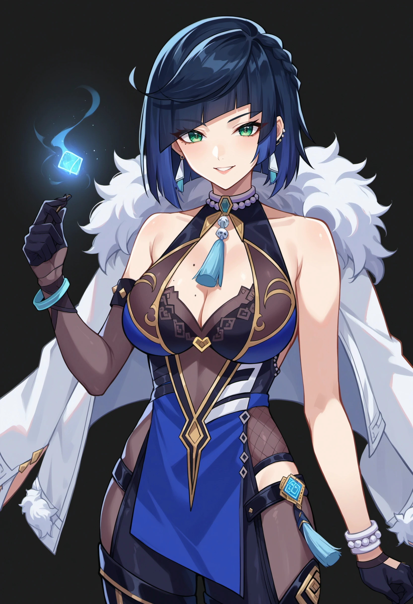 yelanv11, 1girl,breasts, looking at viewer, smile, short hair, bangs, large breasts, gloves, dress, holding, cleavage, jewelry,green eyes,blue hair,jacket,earrings,sleeveless,black gloves,bob cut,white jacket,fur-trimmed jacket