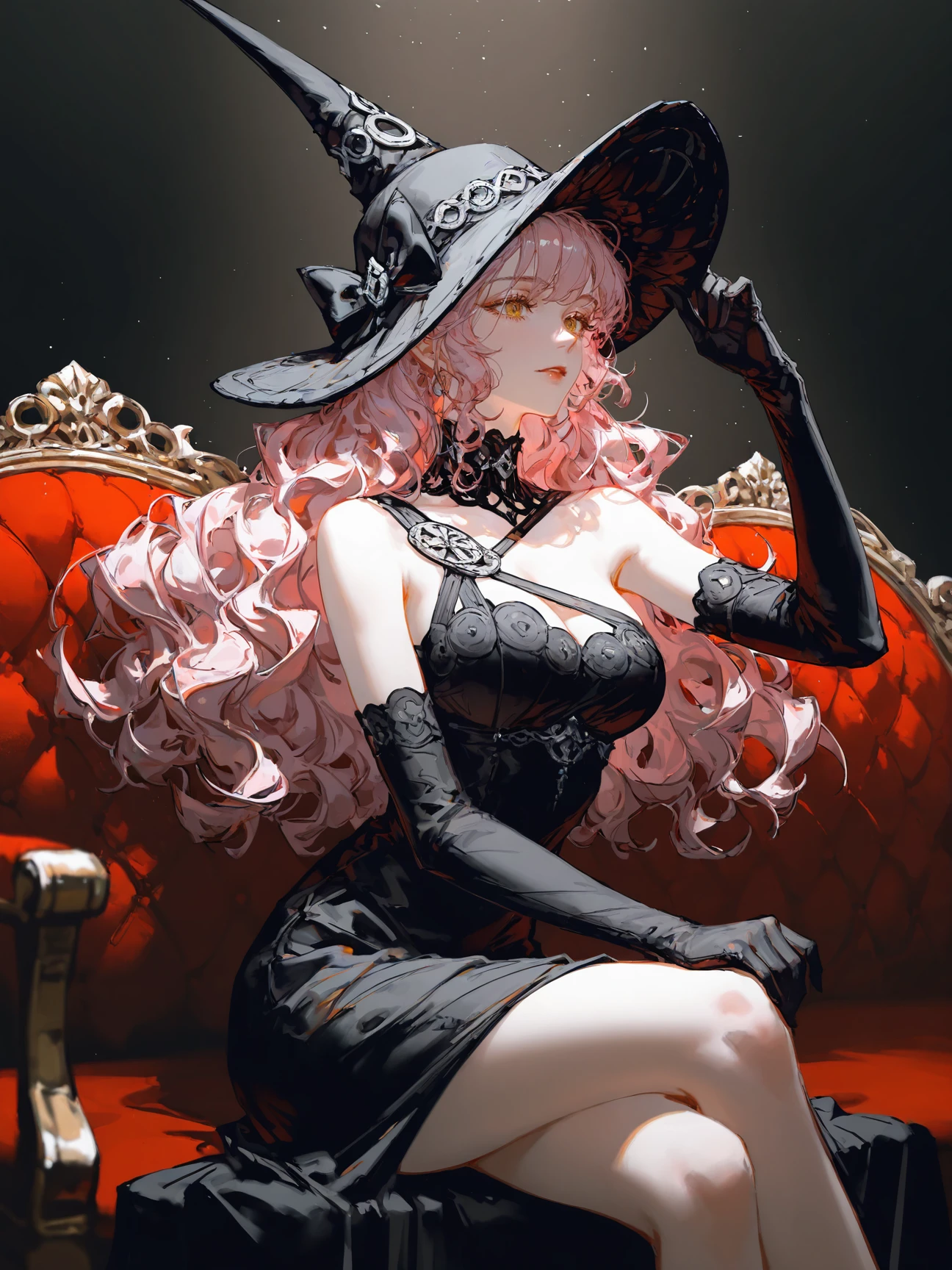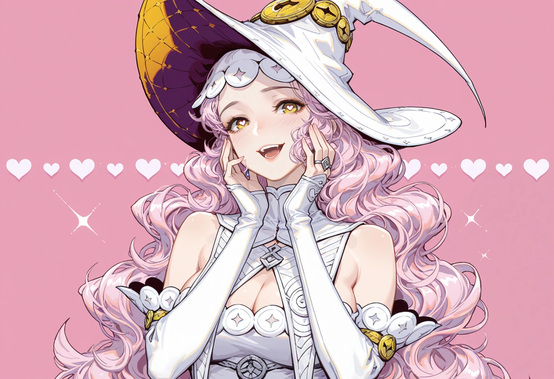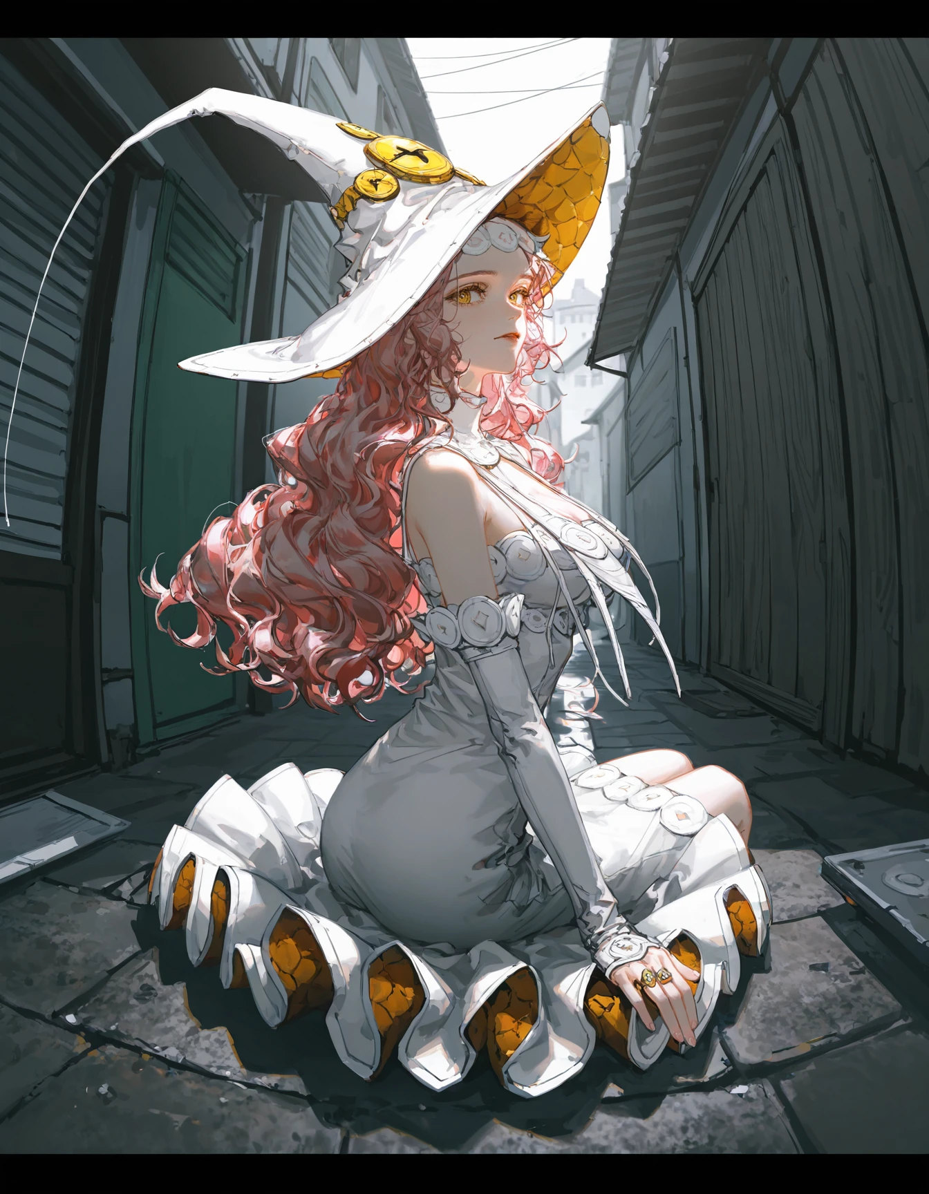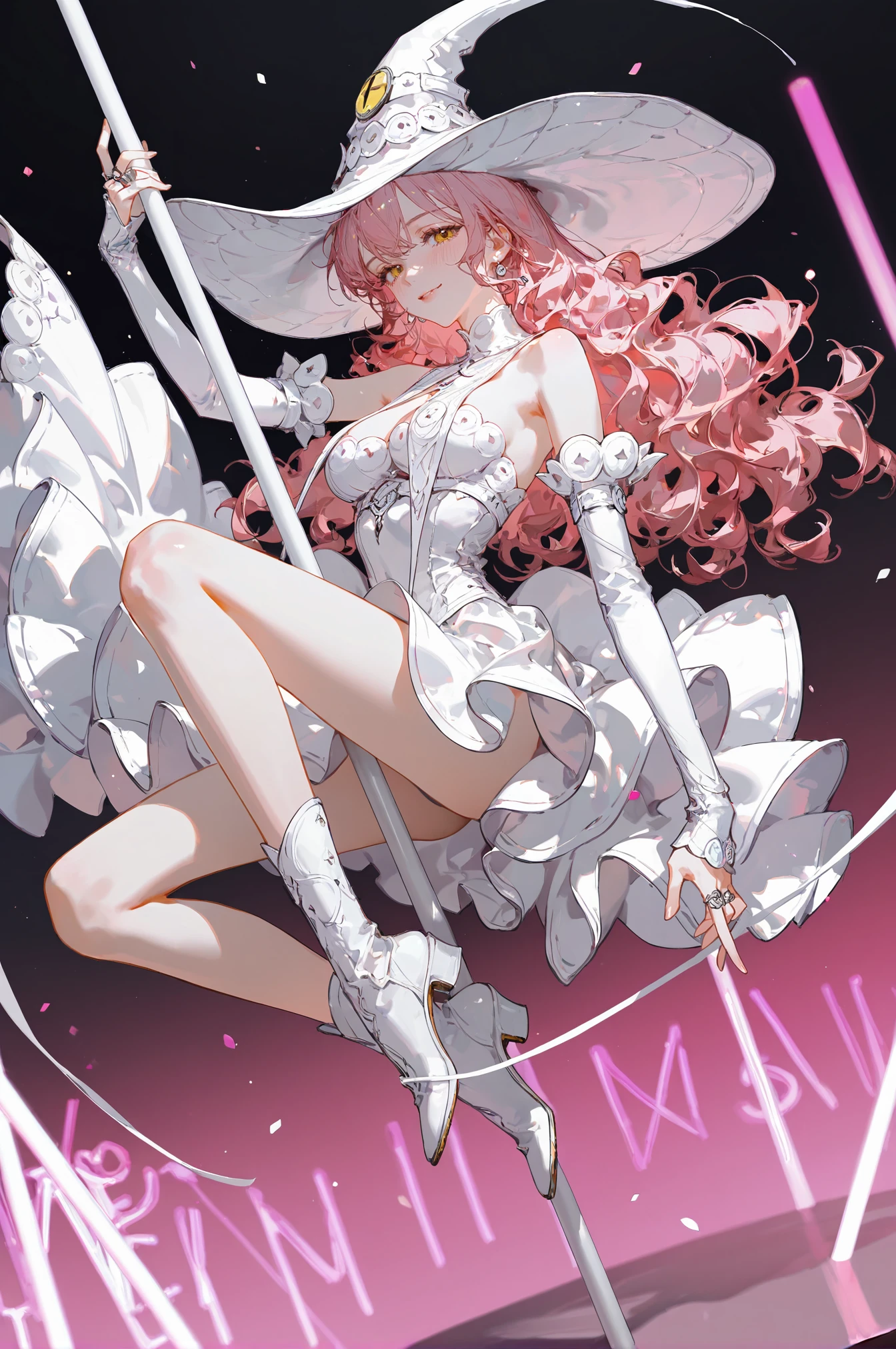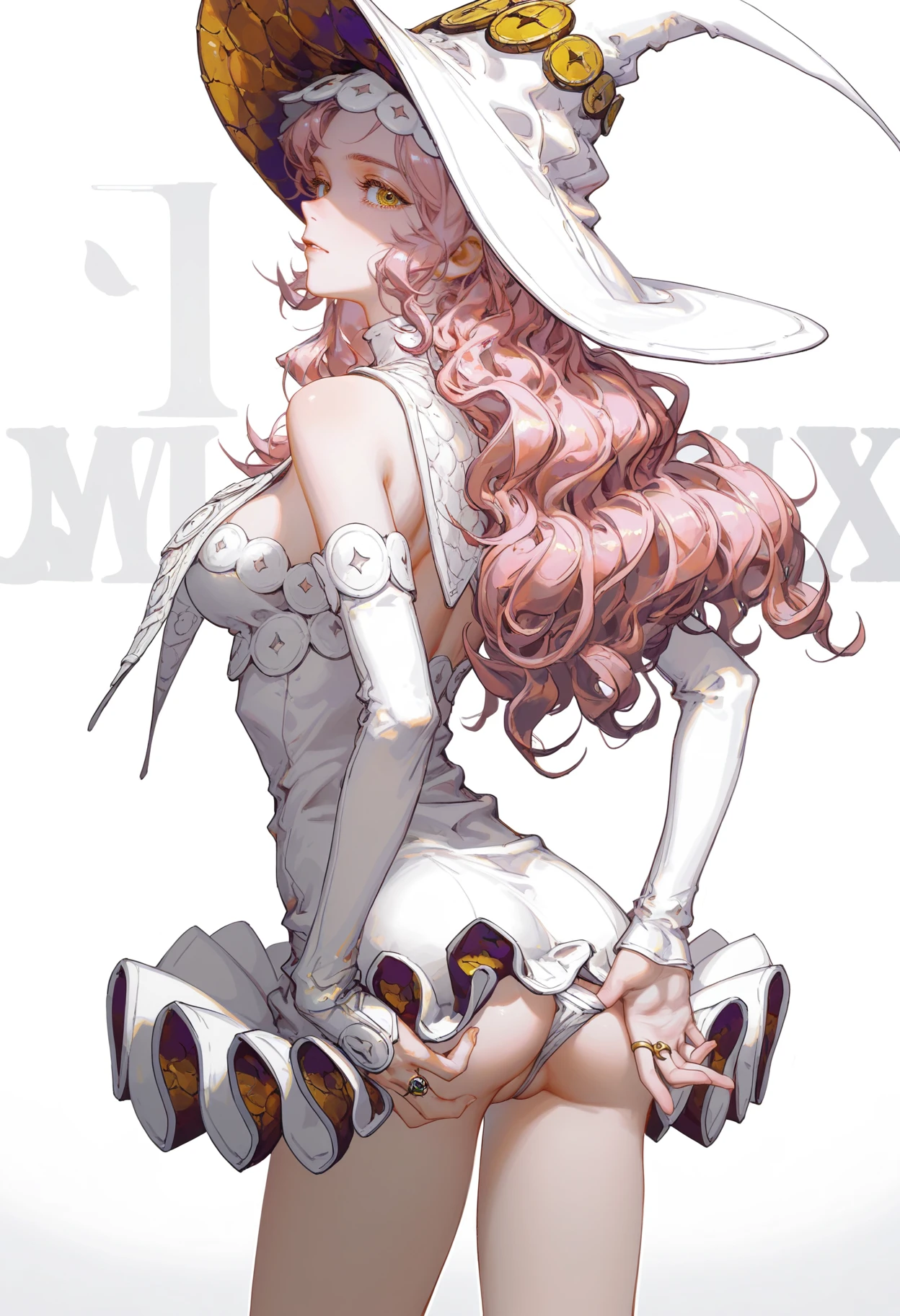 Optional clothing tags 1 可选衣服:yifu,witch,witch hat,white dress,white headwear,detached sleeves,bare shoulders,white long gauntlets,cleavage,jewelry,ring,white footwear,yellow ruffled skirt,breast curtain,