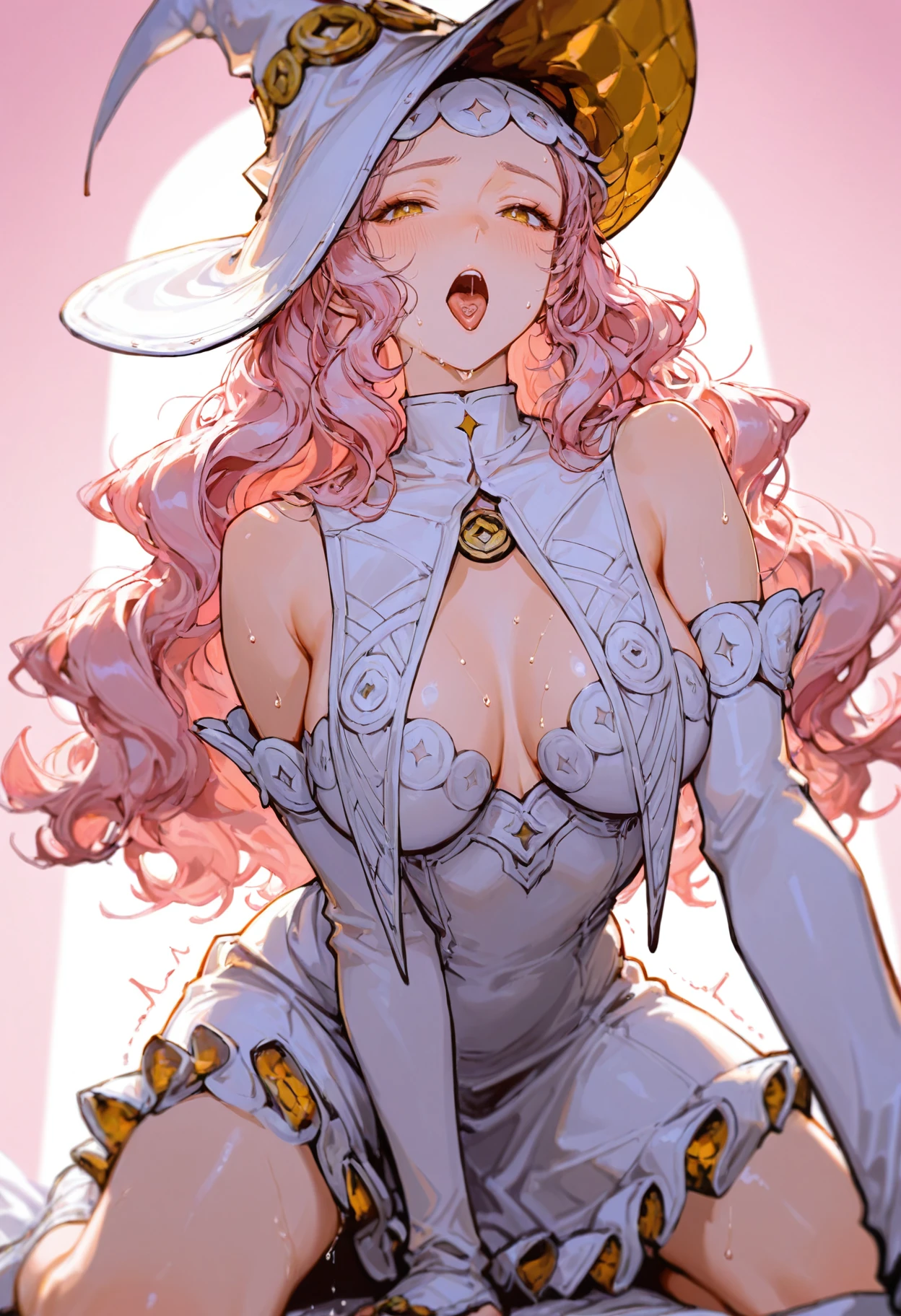 yifu,witch,witch hat,white dress,white headwear,detached sleeves,bare shoulders,white long gauntlets,cleavage,jewelry,ring,white footwear,yellow ruffled skirt,breast curtain,