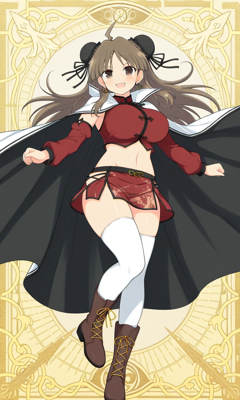 Renka (Senran Kagura), brown eyes, long brown hair, ahoge, double bun, bun cover, hair ribbon, large breasts, Renka earrings, thighs, Renka_Shinobi, chinese clothes, yellow ribbon, crop top, detached sleeves, white cape, miniskirt, white legwear, legwear ribbon, brown boots, boots ribbon, black rags behind