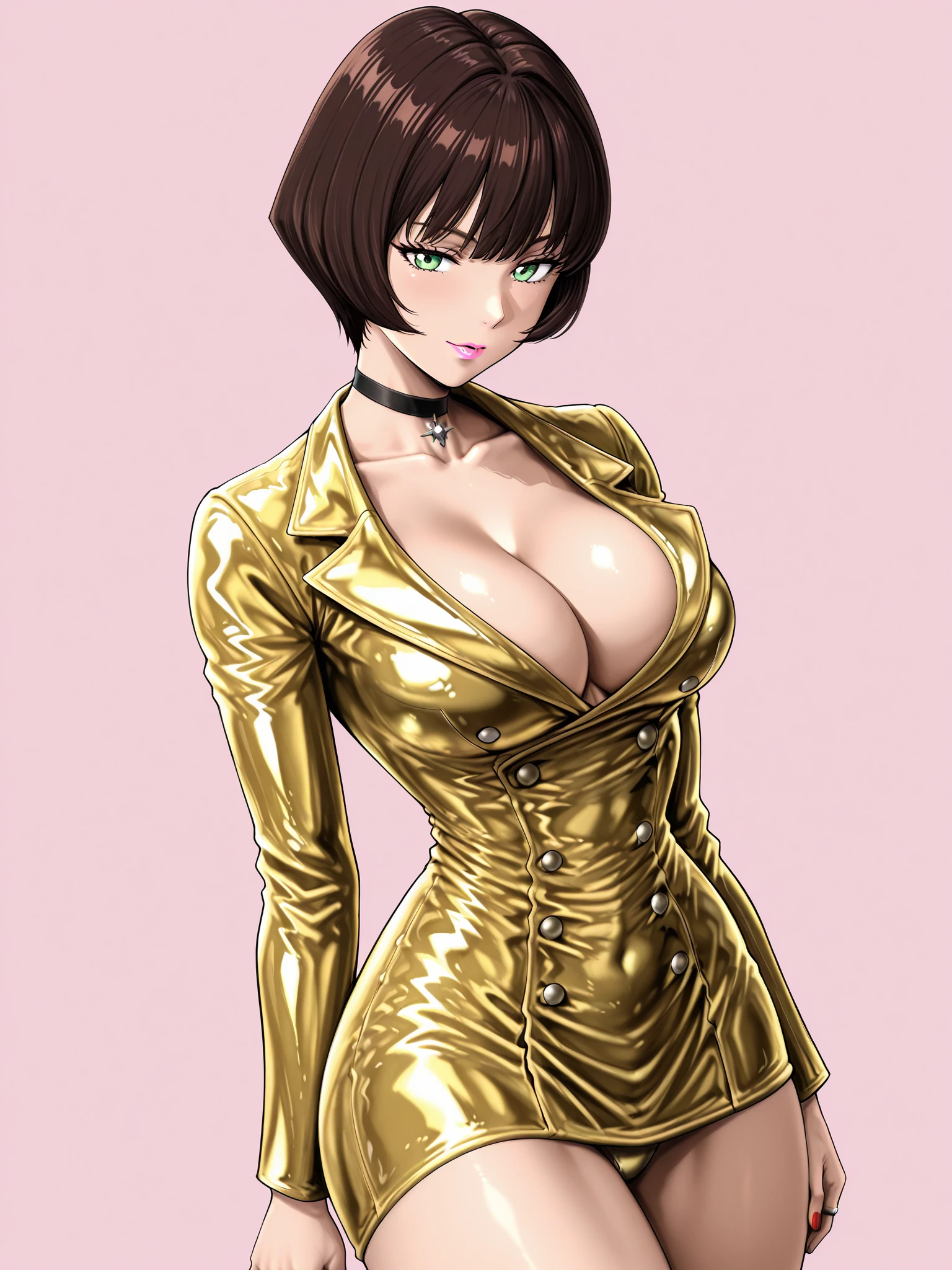 jenny burtory, jenny burtory \(bloody roar 2 leather blazer dress\), 1girl, solo, white skin, collarbone, cleavage, large breasts, dark brown hair, bob cut, green eyes, pale pink lipstick, sliver ring, red nails, black choker, gold leather blazer dress, ten gold buttons, dark gold strappy high heels