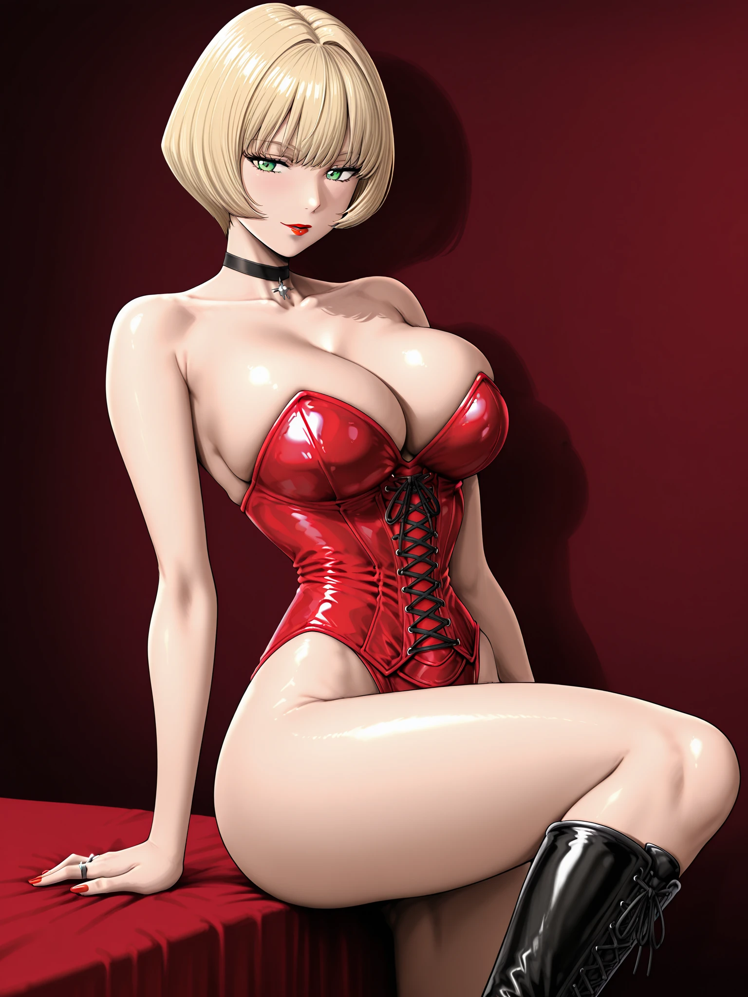 jenny burtory, jenny burtory \(bloody roar 2 lace up corset bodysuit\), 1girl, solo, white skin, collarbone, cleavage, large breasts, blonde hair, bob cut, green eyes, red lipstick, sliver ring, red nails, black choker, red lace up corset bodysuit, strapless, black knee high-heeled boots