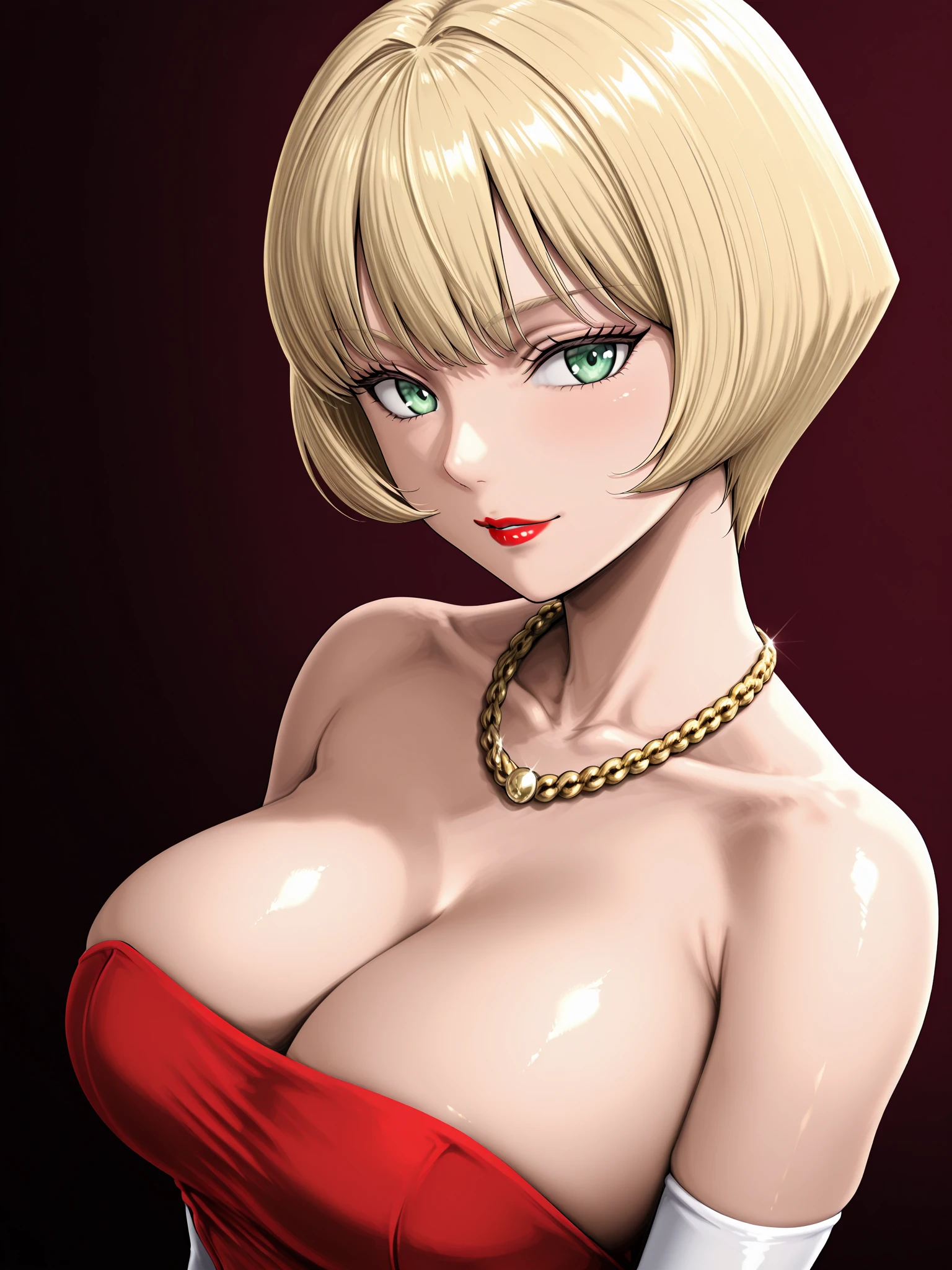 jenny burtory, jenny burtory \(bloody roar 2 V-jump strapless dress\), 1girl, solo, white skin, collarbone, cleavage, large breasts, blonde hair, bob cut, green eyes, red lipstick, white elbow gloves, gold necklace, red long strapless dress, backless outfit, side slit, red high heels