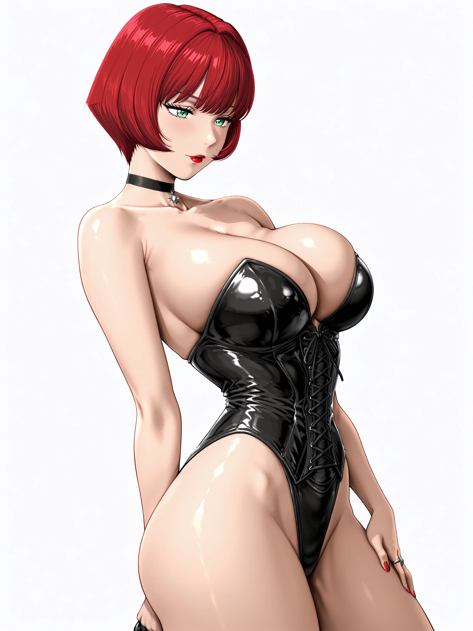 jenny burtory, jenny burtory \(bloody roar 2 lace up corset bodysuit\), 1girl, solo, white skin, collarbone, cleavage, large breasts, red hair, bob cut, green eyes, red lipstick, sliver ring, red nails, black choker, black lace up corset bodysuit, strapless, black high heels