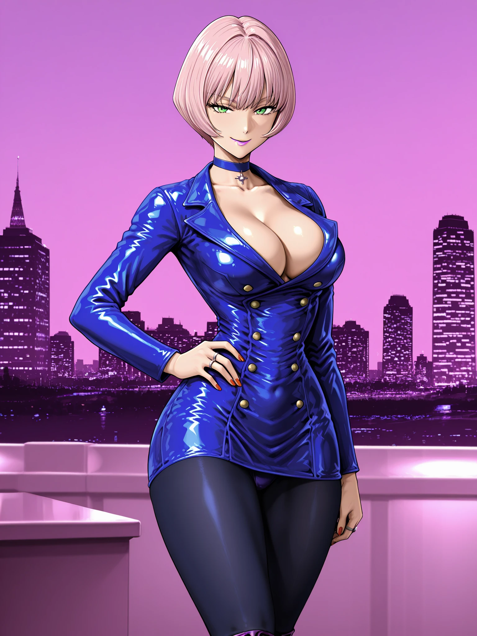 jenny burtory, jenny burtory \(bloody roar 2 leather blazer dress\), 1girl, solo, white skin, collarbone, cleavage, large breasts, pale pink hair, bob cut, green eyes, lavender lipstick, sliver ring, red nails, navy choker, navy leather blazer dress, ten gold buttons, navy pantyhose, lavender knee high-heeled boots